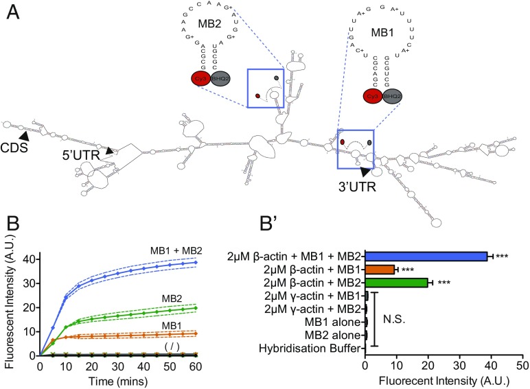 Fig. 1. Molecular beacons selectively label β-actin mRNA to single-nucleotide precision in vitro. (A) Schematic showing the predicted secondary structure of the sequences of each molecular beacon used to target β-actin mRNA (mFOLD) and the molecular beacon sequences used to target predicted single-stranded regions in the mRNA. Arrowheads indicate the start site of the 5′ UTR, coding sequence (CDS), and 3′ UTR. (B) The addition of 2-μM β-actin mRNA to 1-μM solutions of MB1 or MB2 significantly increased the fluorescent intensity of the solutions compared with MBs in hybridization solution alone and cumulatively amplified fluorescence further when 2-μM β-actin mRNA was added to 1-μM solutions of MB1 and MB2 together (MB1 + MB2). Below the symbol (/) are the changes in fluorescence over time for 1 μM MB1 alone, 1 μM MB2 alone, hybridization buffer alone, 2 μM γ-actin + MB1, and 2 μM γ-actin + MB2. In contrast, the addition of 2-μM γ-actin mRNA did not elicit a change in fluorescent intensity in solutions containing 1 μM of either MB1 or MB2. (B′) For a clearer comparison, B′ shows the fluorescent intensity of each condition at 60 min. ***P < 0.0001 unpaired Students t test; N.S., not significant; n = 3 replicates per condition. |