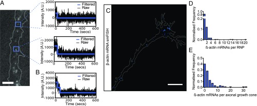 Fig. 3. Endogenous β-actin mRNA stoichiometry in growing axons. (A) Single stepwise photobleaching events were observed using MB1 and HILO microscopy. Black lines represent background-subtracted intensity trace of MB puncta; colored lines show the median intensity of each step after filtering. (Scale bar: 5 μm.) (B) An example of two stepwise photobleaching events in one trace. (C) Representative image of β-actin mRNA distribution using smFISH. (Scale bar: 10 μm.) (D) Frequency distribution of the number of β-actin mRNAs per RNP calculated from smFISH spot intensity distributions. (E) Variability in the number of β-actin mRNAs within axonal growth cones was observed. n = 35 RNase-A–treated axons and n = 100 untreated axons. |