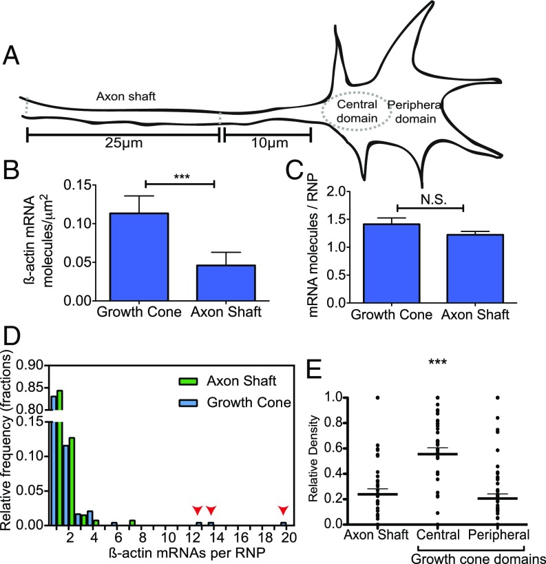 Fig. 4. smFISH reveals that the localization patterns of β-actin mRNA vary according to axonal subcompartment. (A) Cartoon representation of the different axonal regions analyzed. (B) A comparison of the density of β-actin mRNA molecules in the growth cone and axon shaft via smFISH shows significantly increased density of β-actin mRNA in the growth cone. (C) No difference between β-actin mRNA RNP stoichiometry was observed in the different subcompartments. N.S. not significant. (D) Histogram of β-actin mRNA stoichiometry. Arrowheads indicate more highly multiplexed copy numbers in the growth cone. (E) Relative density of β-actin mRNA across subcompartments of the same axon shows significant enrichment in the central domain of the growth cone. ***P < 0.0001; paired Studentâs t test; n = 63 axons. |