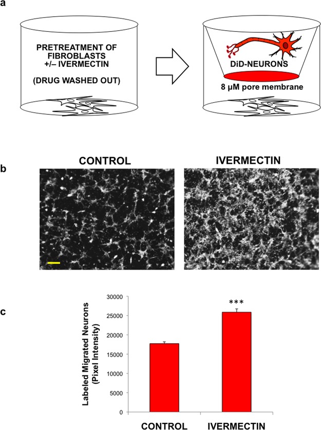 pretreated with or without ivermectin, scale bar: 200 μM. (c)