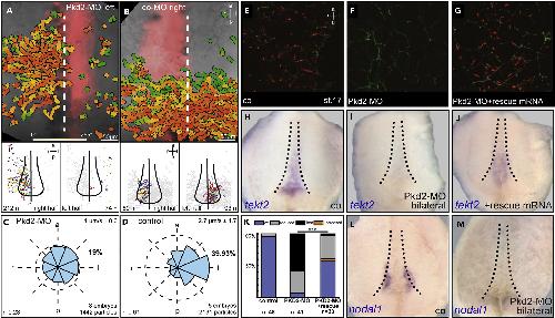 Figure 3. Leftward Flow and GRP Morphogenesis Are Compromised in pkd2 Morphants(AâD) Unilateral injection of Pkd2-MO (A) but not co-MO (B) caused disruption of leftward flow at targeted area (red fluorescence: lineage tracer), as revealed by gradient time trail (GTT); see Transparent Methods section and Schweickert et al., (2007) analysis. Quantification of directionality and velocity of bead transport on morphant (C) and control (D) sides of dorsal explants. Rho (r) represents a value for robustness of directionality of leftward flow. Scale bars represent 50 micrometers.(EâG) Stage 17 GRP ciliation (E) was lost in pkd2 morphants (F) and regained in specimens co-injected with pkd2-MO and a full-length pkd2 mRNA. IF with acetylated α-tubulin antibodies (red) and Alexa 488-phalloidin (green) to highlight GRP cilia and cell borders.(HâK) tekt2 expression at the GRP of stage 17 dorsal explants (H) was lost in pkd2 morphants (I) and rescued upon co-injection of a full-length pkd2 mRNA (J). (K) Quantification of results.(L and M) nodal1 expression in lateral GRP cells (L) was lost in morphants (M).See also Figure S3 and Video S1 |