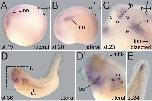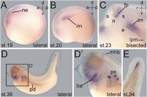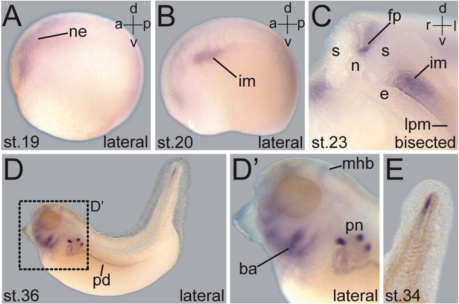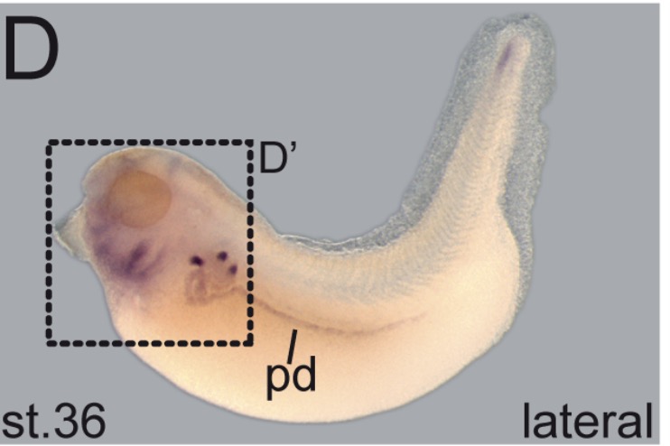 Figure S1: Related to Figure 1. Late expression pattern of pkd2. Expression in the neuroectoderm (A-C), intermediate mesoderm (B, C), pronephric system (D), branchial arches (Dâ) and tailbud (E) in early to late tailbud stages. Key: a, anterior; ba, branchial arches; d, dorsal; e, endoderm; fp, floorplate; im, intermediate mesoderm; l,left; lpm, lateral plate mesoderm; mhb, mid hindbrain boundary; n, notochord; ne, neuroectoderm; pd, pronephric duct; pn, pronephros; r, right; s, somites; v, ventral |
