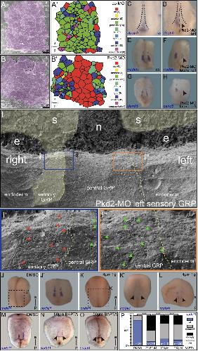 Figure S3: Related to Figure 3. GRP defects in pkd2 morphants (A, B) SEM analysis of co-MO (A) and Pkd2-MO (B) injected specimens reveal loss of ciliation and altered GRP cell morphology in morphants. Examples are representative for 6 specimens analyzed each. Scale bars represent 20 micrometers. (C-H) Unilateral absence of dnah9 (D), nodal1 (F) and dand5 (H) in left-injected embryos in comparison to internal control sides at stage 17. Control embryos (C, E, G) show wildtype expression levels. (I) SEM analysis of ciliation and cell morphology in dorsal explant of stage 17 specimen unilaterally injected with Pkd2-MO targeted exclusively to the lateral, sensory part of the GRP. Shown is a ventral view of the GRP broken transversally and revealing the deep tissue arrangements in the top half of the picture. Right (Iâ) and left (Iââ) magnifications show both the sensory areas of the GRP. Note that the lateral GRP cells were absent on the MO-injected side, such that central GRP cells, which are characterized by posteriorly polarized cilia, directly bordered non-ciliated endodermal cells. Sensory GRP cilia highlighted with red arrowheads, central GRP cilia with green arrowheads. (J-L) Expression of nodal1 in lateral GRP cells of flow stage (st. 17) specimens following Tp (K, L) or 1% DMSO (J) treatment during mid to late gastrula stage (st. 11.5). nodal1 was lost (Kâ) or strongly reduced (L) after Tp treatment, without causing gastrulation defects. (M-P) Expression of nodal1 in lateral GRP cells of flow stage (st. 16-19) specimens following 25-200µM BAPTA-AM (N-P) or 0.05-1% DMSO (M, P) treatment during mid and late gastrula stages (st. 11.5- 13/14). nodal1 was lost (O) or reduced (N) after BAPTA-AM treatment. *p<0.05, **p<0.01, **p<0.001 Black arrowheads indicate reduction or lack of expression. a, anterior; e, endoderm; l, left; n, notochord; p, posterior; r, right; s, somites |
