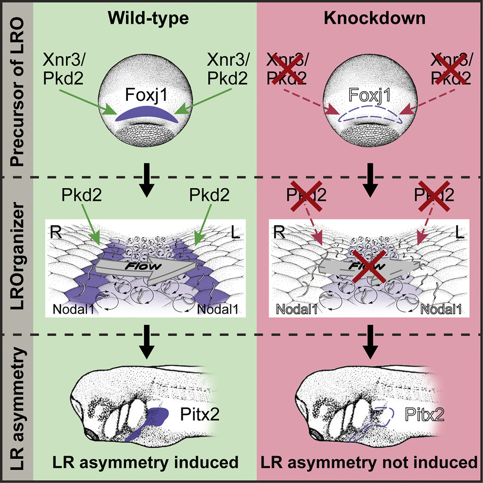 Nodal signaling controls asymmetric organ placement during vertebrate embryogenesis. Nodal is induced by a leftward fluid flow at the ciliated left-right organizer (LRO). The mechanism of flow sensing, however, has remained elusive. pkd2 encodes the calcium channel Polycystin-2, which is required for kidney development and laterality, and may act in flow perception. Here, we have studied the role of Polycystin-2 in Xenopus and show that pkd2 is indispensable for left-right (LR) asymmetry. Knockdown of pkd2 prevented left-asymmetric nodal cascade induction in the lateral plate mesoderm. Defects were due to failure of LRO specification, morphogenesis, and, consequently, absence of leftward flow. Polycystin-2 synergizes with the unconventional nodal-type signaling molecule Xnr3 to induce the LRO precursor tissue before gastrulation, upstream of symmetry breakage. Our data uncover an unknown function of pkd2 in LR axis formation, which we propose represents an ancient role of Polycystin-2 during LRO induction in lower vertebrates.
