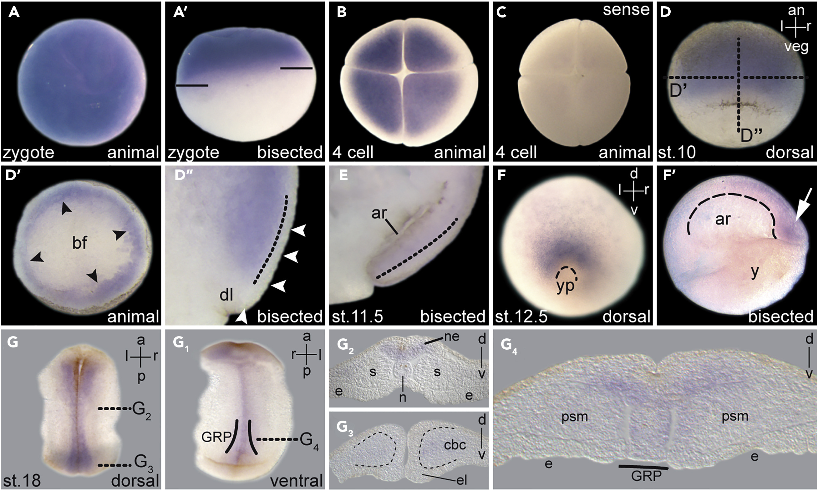 Figure 1. Expression of pkd2 mRNA during Xenopus Embryogenesis. (AâC) Maternally deposited mRNA localized to the animal hemisphere of the zygote (A, Aâ²) and four-cell stage embryos (B). Note animal-vegetal shift of expression as indicated in the zygote. (C) Lack of a specific signal in specimen hybridized with a sense probe. (DâF) pkd2 transcripts in deep mesodermal layers of the early gastrula (D, Dâ², Dâ²; black arrowheads; plane of section indicated in D by dotted line), in dorsal notochordal mesoderm at mid gastrula (E), and in tail organizer (white arrow) and posterior notochord at late gastrula stages (F, Fâ²). Please note the lack of transcripts in the dorsal lip and the SM (white arrowheads). Border of inner and outer layer of marginal zone indicated by dotted line. Yolk plug and archenteron roof indicated by dashed lines. (G) Deep neuroectodermal, tail organizer, and posterior notochordal expression at neurula stages; no expression of GRP detected (G4). a, anterior; an, animal; ar, archenteron; bf, blastocoel floor; cbc, circumblastoporal collar; dl, dorsal lip; e, endoderm; el, epithelial layer (of cbc); l, left; n, notochord; ne, neuroectoderm; psm, presomitic mesoderm; r, right; s, somites; v, ventral; veg, vegetal; yp, yolk plug. |