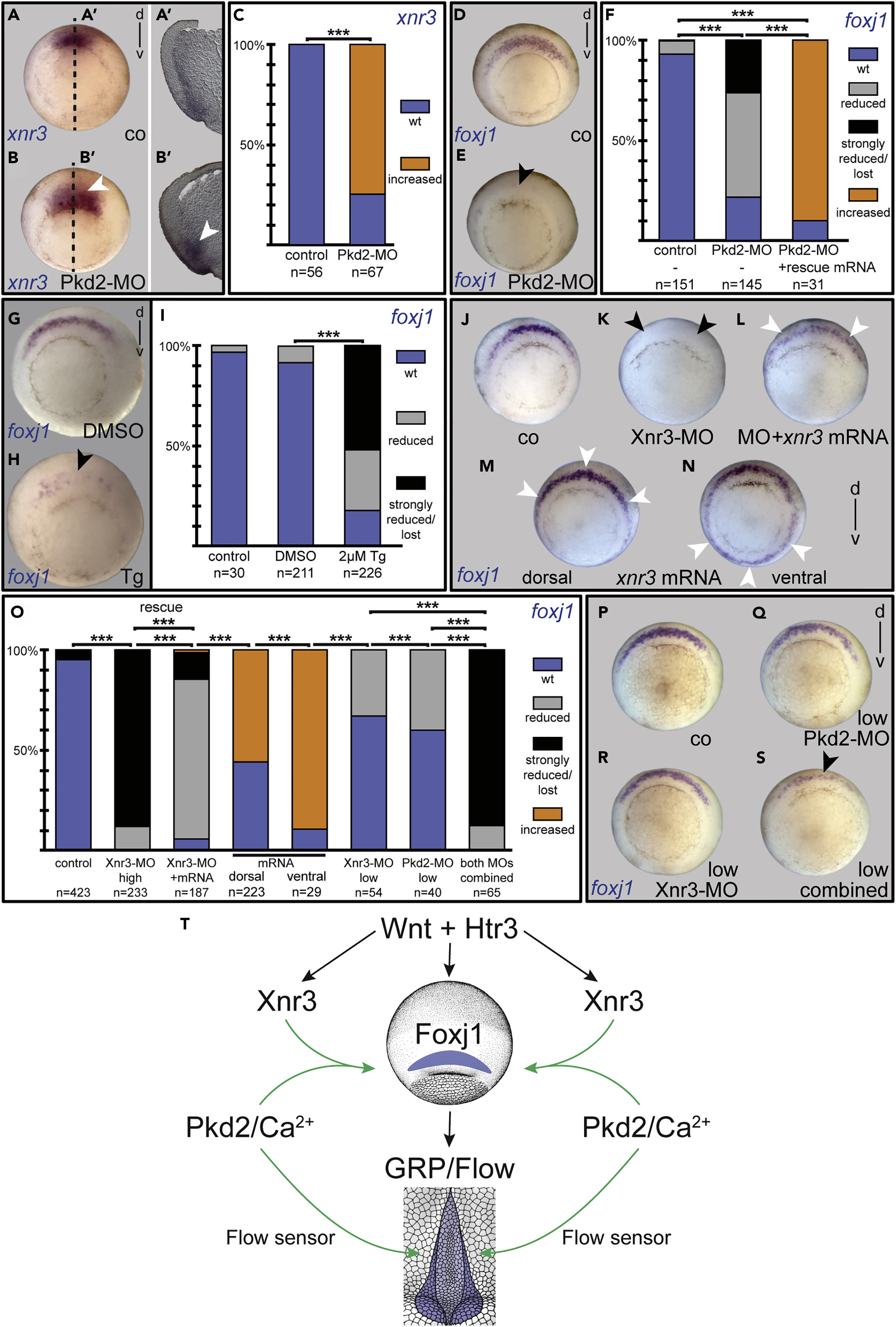 Figure 4. Polycystin-2 and Xnr3 Synergize to Induce the LRO Precursor Tissue of the Superficial Mesoderm(AâF) Increased xnr3 (AâC) and reduced foxj1 expression (DâF) in stage 10.5 pkd2 morphants (B and E) as compared with control specimens (A and D). Dotted lines in A and B indicate plane of histological sections shown in Aâ², and Bâ², respectively. Note that foxj1 expression was rescued upon co-injection of a full-length pkd2 mRNA (F).(GâI) Reduced foxj1 expression in early gastrula stages (st. 10.5) following Tg treatment (G, DMSO control embryo; H, Tg treated specimen; I, quantification of results).(JâS) xnr3 and pkd2 synergize SM foxj1 induction. Loss of xnr3 resulted in attenuated foxj1 expression (K and O) compared with control uninjected specimens (J and O), which was highly efficiently rescued by co-injection of full-length xnr3 mRNA (L and O). Both dorsal (M) and ventral (N) overexpression of xnr3 mRNA caused an increase of endogenous or induction of ectopic foxj1, respectively (MâO). Injections of reduced MO doses of Xnr3-MO (O, R; 2 à 0.6pmol) or Pkd2-MO (O, Q; 2 à 0.75pmol) caused mild reductions of foxj1 expression. Co-injection of low doses of MOs resulted in strong inhibitory effects (O and S).(T) Schematic depiction of known (black) and proposed (green) interactions required for SM specification. For details refer to main text. Increase of expression highlighted with white arrowheads and decrease with black arrowheads. Numbers in parentheses indicate the number of embryos analyzed for each condition.See also Figures S4 and S5. |