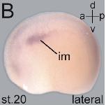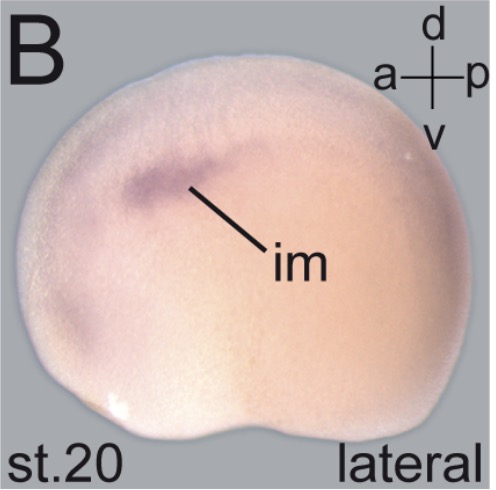 pkd2 (polycystin 2, transient receptor potential cation channel) gene expression in Xenopus laevis embryo, assayed via in situ hybridization, NF stage 20, lateral view, anterior left, dorsal up. Key: im, intermediate mesoderm. |