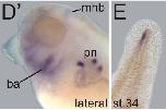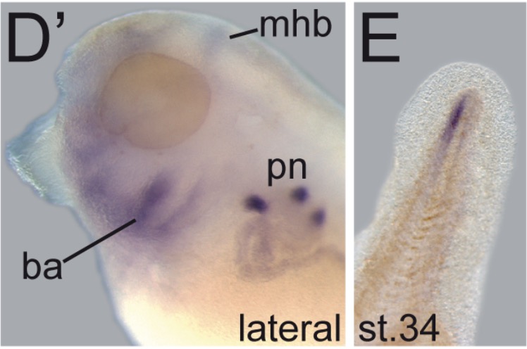 pkd2 (polycystin 2, transient receptor potential cation channel) gene expression in Xenopus laevis embryo, head region, assayed via in situ hybridization, NF stage 36, and tail tip at NF stage 34, lateral view, anterior left, dorsal up. Key: pn, pronephric nephrostomes; ba, pharyngeal/branchial arches; mhb, mid hindbrain boundary. |
