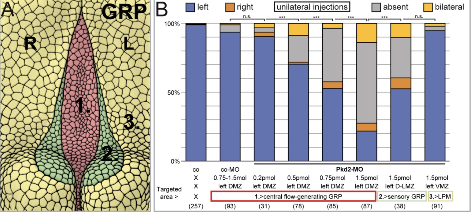 Figure S2: Related to Figure 2. Lineage-specific knockdown of pkd2 reveals a left-sided dorsal requirement of Polycystin-2 in the LRO (A) Schematic depiction of the differentially targeted areas of the gastrocoel roof in a dorsal explant of a stage 17 neurula embryo with the central, flow-generating population of the LRO (1. red), the lateral, sensory population of the LRO (2. green), and the surrounding endodermal cells (3. yellow) that cover the lateral plate mesoderm, which will express nodal and pitx2c on the left side after flow-dependent symmetry breakage to govern asymmetric organogenesis. (B) Unilateral left-sided pkd2 knockdown experiment showing dose-dependent loss of pitx2c when injected into the left dorsal marginal zone (DMZ) to target the central, flow-generating GRP. Injection into the dorso-lateral marginal zone (D-LMZ) to target the sensory part of the GRP (i.e. the lateral LRO cells) caused fewer, yet significant LR defects. Injecting the ventral marginal zone (VMZ) to target the left lateral plate mesoderm did not result in miss-expression of pitx2c. *p<0.05, **p<0.01, **p<0.001 for all panels. |