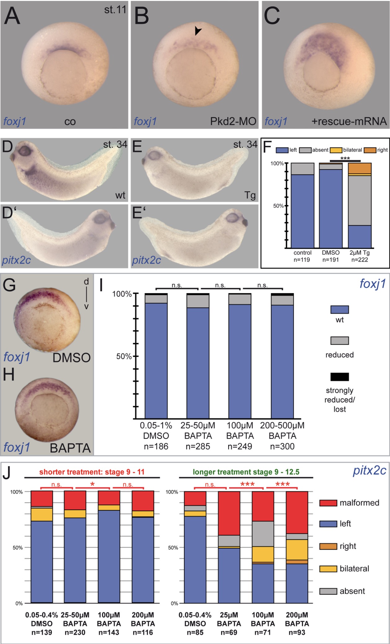 Figure S4: Related to Figure 4. Calcium manipulating agents Thapsigargin or BAPTA-AM impacted differently on LR development (A-C) foxj1 expression (A) was reduced in pkd2 morphants (B) and rescued upon co-injection of Pkd2- MO and a full-length pkd2 rescue mRNA not targeted by the MO (C). (D-F) A 20-minute thapsigargin treatment before gastrulation resulted in loss of pitx2c expression in >50% of embryos without concomitant gastrulation defects, reminiscent of Pkd2-MO injected specimens (cf. Figure 2D). (G-J) Treatment of embryos between blastula (st. 9) and early gastrula stages (st. 10.5) with different concentrations of the calcium chelator BAPTA-AM did not reduce foxj1 expression (H, I), in comparison to 0.05-1.00% DMSO treatment (G, I). (J) Embryos analyzed for pitx2c expression at tailbud stages after short (left side, until stage 11) or long (right side, until stage 12.5) treatment with BAPTA-AM. Longer (st. 9-12.5), but not short treatment (st. 9-11) resulted in significant LR defects. Please note the high proportion of embryos with general axis malformations when treated until late gastrulation (right side) as compared to shorter treatment (left side). Significances in (J) were calculated for LR expression patterns of pitx2c only, not including malformed embryos, which are also shown in the graph. *p<0.05, **p<0.01, **p<0.001 for all panels |