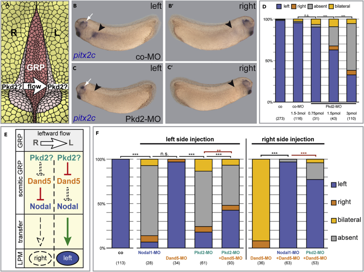 Figure 2. pkd2 Is Required for LR Asymmetry in Xenopus, Independently of dand5(A) Putative sensory function of Polycystin-2 during symmetry breakage downstream of GRP-flow.(BâD) Dose-dependent loss of left-sided pitx2c expression following Pkd2-MO targeting to the GRP. Black arrowhead indicates approximate location of present or absent pitx2c expression on both sides of the embryo. White arrow highlights expression of pitx2c around the eye as proof of working ISH.(E) Model of hierarchy of the flow sensing module and possible role of pkd2 on the lateral side of the LRO downstream of flow and upstream of Dand5.(F) Epistatic single and double knockdown experiments, performed on the left or right side, as indicated. Differences in expected and experimental outcome highlighted by red significance. See text for details.See also Figure S2.**p < 0.01, ***p < 0.001 in all Figures.Numbers in parentheses indicate the number of embryos analyzed for each condition. |