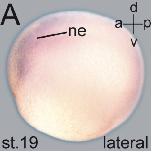 pkd2 (polycystin 2, transient receptor potential cation channel) gene expression in Xenopus laevis embryo, assayed via in situ hybridization, NF stage 19, lateral view, anterior left, dorsal up. Key: ne= neuroectoderm. |