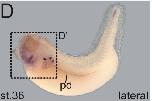 pkd2 (polycystin 2, transient receptor potential cation channel) gene expression in Xenopus laevis embryo, assayed via in situ hybridization, NF stage 19, lateral view, anterior left, dorsal up. Key: pd, pronephric duct. |