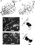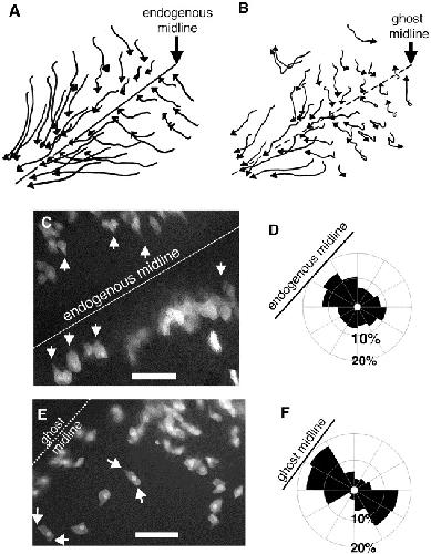 Fig. 2. Cell paths and cell protrusive activity in deep-neural-over-mesoderm and midlineless explants. In (A, B), tips of arrows show the position of cells at the beginning of a time lapse, the arrowhead represents cell location at the end of the time lapse, and the stem depicts the path of the cell. (A) Lateral cells in deep-neural-over-mesoderm explants translocate medially toward the midline notochord/floor plate, resulting in convergence and extension. (B) Even though the midline tissues have been removed, lateral neural cells in midlineless explants also move medially toward the midline of the explants, albeit they do so less aggressively than cells in deep-neural-over-mesoderm explants. Arrows at the edge of the explants move outward. These are probably ectodermal cells, and can sometimes be seen in deep-neural-over-mesoderm explants, though more rarely than in midlineless explants because they are generally too wide to encompass ectodermal cells on the computer screen. (C, D) The protrusive activity of lateral neural cells in deep-neural-over-mesoderm and midlineless explants. (C) Lateral neural cells in deep-neural-over mesoderm explants have lamellopodia pointed toward the midline. Arrows point to protrusions. (D) A bullet diagram quantifies the protrusions of one cell traced from a control explant; it shows a clear bias in the direction of the midline tissues in the explant. Scale bar, 0.1 mm. (E, F) The protrusive activity of lateral neural cells in midlineless explants. (E) Frame from a time-lapse sequence, showing motile cells in midlineless explants. Arrows point to protrusions. (F) A bullet diagram shows the distribution of protrusions over time for one cell analyzed from a midlineless explant; the cell is aligned along the mediolateral axis of the explant. Scale bar, 0.1 mm.