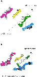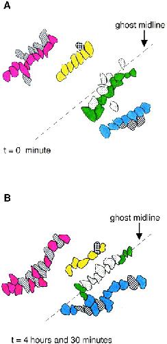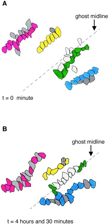 Fig. 3. Conservative intercalation occurs in midlineless explants. Colored cells show columns of cells that were traced to the end of the movie to see which cells intervened between them. Patterned cells are the cells that intervened between the colored cells. (A) Unbroken columns of cells at the beginning of a timelapse series. (B) By the end of the time lapse, patterned cells have intercalated between the colored cells; however, they were very close neighbors of the colored cells at t = 0.