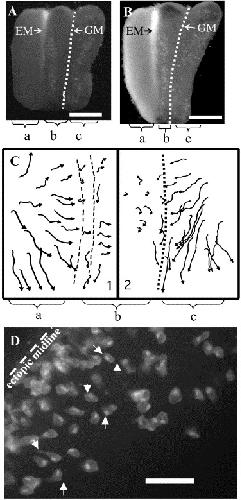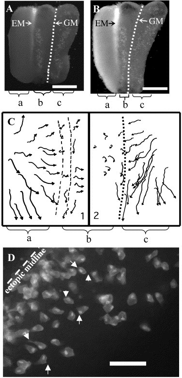 Fig. 4. Motility in midlineless-explants-with ectopic-midline. (A, B) A midlineless-explant-with-ectopic-midline made from an Otx2:GFP transgenic embryo converges and extends between t = 0 (A) and t = 4.5 h (B). The notochord lights up with GFP driven by the Otx2 promoter, demarcating the ectopic midline; the ghost midline is shown as a dotted white line. Labeled cells (white sprinkle) sandwiched between the ectopic midline and the ghost midline (section âbâ) were followed for translocation (direction of their overall displacement) and protrusive activity. Scale bar in (A) and (B), 0.5 mm. (C) In midlineless-explants-with-ectopic-midline, cells in the neural plate of the donor midline (section âaâ) converge to that midline. The two parallel dashed lines represent the edges of the notochord seen through the deep neural plate. Cells in the midlineless component of the explant (section âbâ) still converge and extend, although their movement is erratic. Cells in section âcâ get displaced toward their endogenous (ghost) midline through intercalation. The two parallel dashed lines represent the ectopic midline, and the dotted line is the ghost midline, at the beginning of the time-lapse sequence. The two panels, (1) and (2), come from two different embryos. (D) Frame from a movie shows protrusive cells in the section âbâ of an explant with an ectopic midline. Arrows point to protrusions. Scale bar; 0.1 mm.