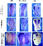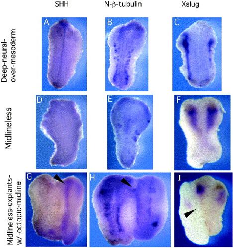 Fig. 6. Patterning of deep-neural-over-mesoderm explants, midlineless explants and midlineless-explants-with-ectopic-midline. Deep-neural-over-mesoderm explants maintain a very close to normal mediolateral pattern of gene expression as seen through Sonic Hedgehog, N-β-tubulin, and Xslug (AâC). Midlineless explants have no remaining midline, as shown by the absence of SHH expression (D). They express N-β-tubulin, but the pattern of expression of that gene is often disturbed (E), while Xslug is strongly expressed, though variable in breadth (F). Midlineless-explants-with-ectopic-midline have no SHH stripe in the midlineless portion, but it is present in the portion of the ectopic midline as expected (G). In addition, they express N-β-tubulin and Xslug in both the midline-free and the midline-containing parts of the explants (H, I). Pointers indicate the ectopic midline; all explants were fixed for in situ when whole embryos used as control reached stage 21 to 23.