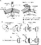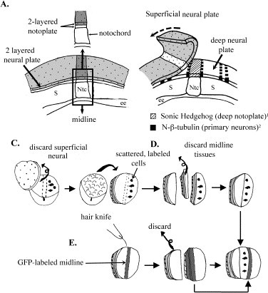 Fig. 1. Explantation technique depicting how explants discussed in this paper are made. (A) This schematic shows the tissues relevant to our explants, including the notoplate, the neural plate (NP), the notochord (Ntc), the somitic mesoderm (S), endodermal epithelium (ee), and the midline (notoplate, notochord and underlying endodermal epithelium). (B) This schematic shows the expression of genes relevant to this paper, including Sonic Hedgehog in the deep notoplate, and N-β-tubulin in the deep neural plate. (C) Deep-neural-over-mesoderm explants: We first remove and discard the superficial neural tissue (dotted) at stage 13. We then explant the dorsal 180 degree sector of the embryo and culture it under coverslip. The dashed lines represent the edges of the notochord, slightly visible under the deep neural tissue. (D) Midlineless explants start as deep-neural-over-mesoderm explants, from which we subsequently remove the notochord, notoplate and underlying endoderm. We then push together the two lateral sections of deep neural tissue over somitic mesoderm and allow healing to occur. (E) Midlineless-explants-with-ectopic-midline require at least two embryos. The first embryo was previously injected with red dextran at stage 6 1/2 to produce a scatter of red labeled cells (red scattered cells). The second embryo was either injected with fluorescein dextran at the one-cell stage and was therefore entirely green fluorescent or was a transgenic Otx2:GFP embryo with a green fluorescent notochord (as depicted in this figure). NP, Neural plate; S, Somitic mesoderm; Ntc, Notochord; ee, Endodermal epithelium; sup, superficial; mdln tiss, midline tissues; h.k., hair knife. Davidson and Keller, 19991; Lance Davidson, unpublished observations.2