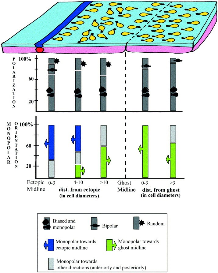 Fig. 5. Polarization and orientation of cells in midlineless-explants-with-ectopic-midline. The schematic at the top summarizes the state of polarization of cells in this style of explant. All cells become monopolar and oriented to whichever midline is closest to them, except for cells that are equidistant from the ghost and the ectopic midline, which instead point toward more random directions. Below the schematic of the explant, the two graphs categorize cells by distance from the ectopic or the ghost midline along the x-axis (0–3, 4–10, and over 10 cells away from the ectopic midline; 0–3 and over 3 cells away from the ghost midline). The top graph shows the percentage of cells in particular polarization states (monopolar and biased combined, bipolar, and random), and the bottom graph shows the percentage of monopolar cells that point in particular orientation.