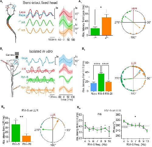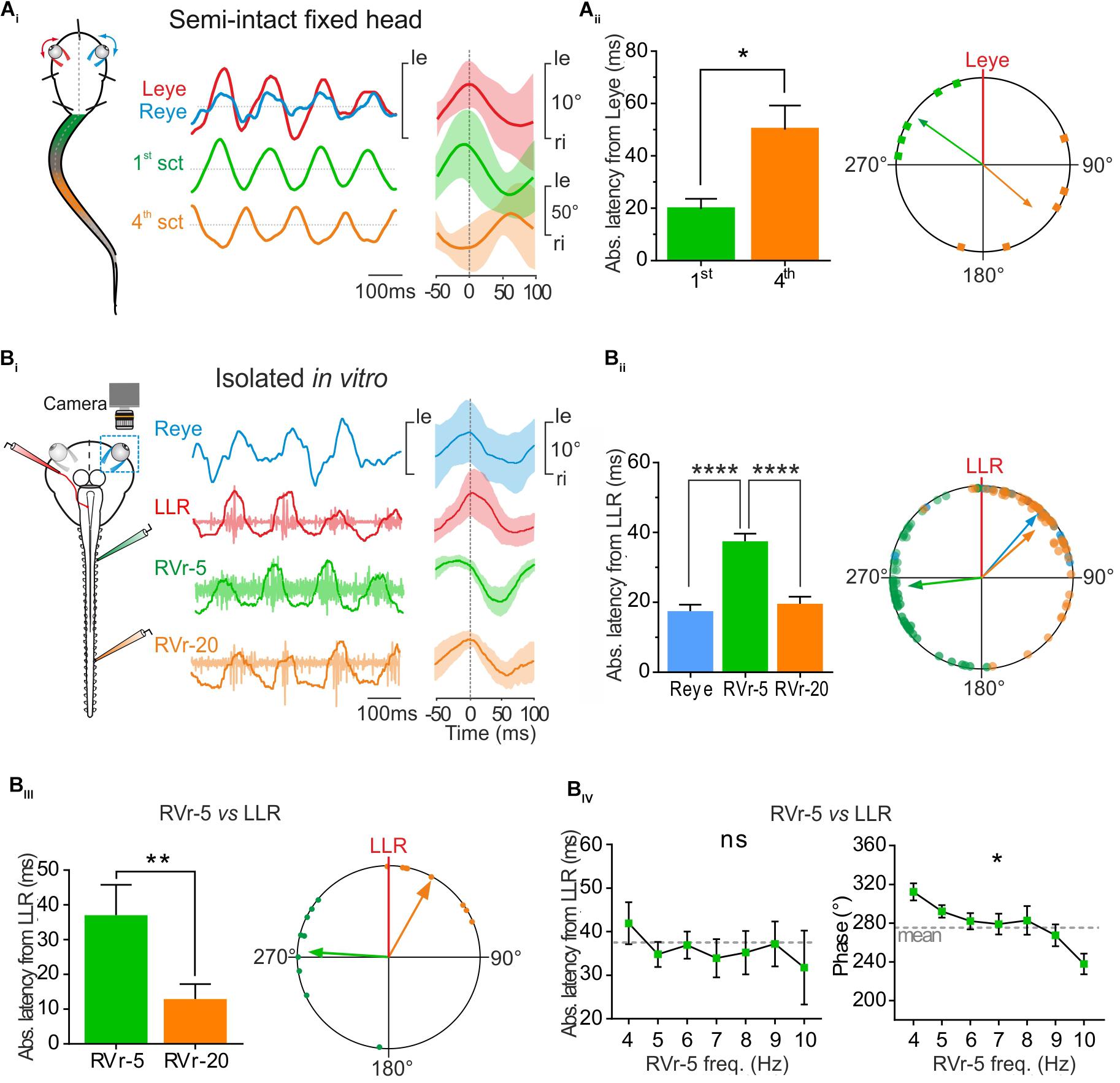 FIGURE 4. Conjugate eye movements generated by propulsive swimming compensate mid-caudal tail undulation. (A) In a head fixed preparation, the left and right eyes (respectively, red, and blue traces) rotated simultaneously in phase with undulation of the 1st tail section and in phase opposition with the 4th tail section. Latency between the peak of eye movements and the 1st tail section (green bar) was significantly lower (Mann–Whitney test, p < 0.05, n = 5) than latency between movements of the eyes and the 4th section of the tail (orange bar), resulting in a significant difference in phase relationship between the 1st and the 4th tail section relative to eye movement (polar plot). (B) Simultaneous recordings of right eye (Reye, blue trace) movements and activity in the left lateral rectus (LLR, red trace) nerve and the 5th (RVr-5) and 20th (RVr-20) right spinal ventral root during in vitro fictive swimming. (Bi) Real (blue) and fictive (red) leftward excursions of the eyes were in phase lag with bursting discharge in the 5th Vr and in reduced phase lead with the 20th Vr, compatible with a compensatory eyes movement during mid-caudal tail undulation (Vr-20). (Bii) Absolute average latency between the Reye movement (blue bar) or RVr-20 bursts (orange bar) and LLR firing were comparable, but significantly lower (Dunn’s multiple comparisons test, p < 0.0001, 61 cycles) than average latency between RVr-5 and LLR bursting (green bar). A significant difference is observed between the phase lead of the 5th ventral root bursting relative to that of the LLR and the phase lag of Reye movement and RVr-20 bursting relative to LLR firing (Watson–Williams F-test, p < 0.001, 61 cycles). (Biii) On different in vitro preparations, the absolute mean latency between RVr-20 and LLR was weak (12.93 ± 4.31 ms) and significantly lower (Mann–Whitney test, p < 0.01, n = 8) than the absolute mean latency between RVr-5 and LLR (37.11 ± 2.74 ms). Therefore, bursting discharges of LLR and RVr-20 (orange arrow) were nearly in phase (37.92°, 0.689, p < 0.001) while bursting discharges of RVr-5 (green arrow) were in phase lead with the LLR (274.41°, 0.65, p < 0.001). These temporal relationships were significantly different (Watson–Williams F-test, p < 0.0001, n = 8). (Biv) The latency between LLR and RVr-5 bursts (left curve) remained constant for fictive swimming frequencies ranging from 4 to 10 Hz (Kruskal–Wallis test, ns, n = 8). According to those latency results, phase shift decreased significantly with increasing fictive swimming frequency (Watson–Williams F-test, p < 0.05, n = 8).