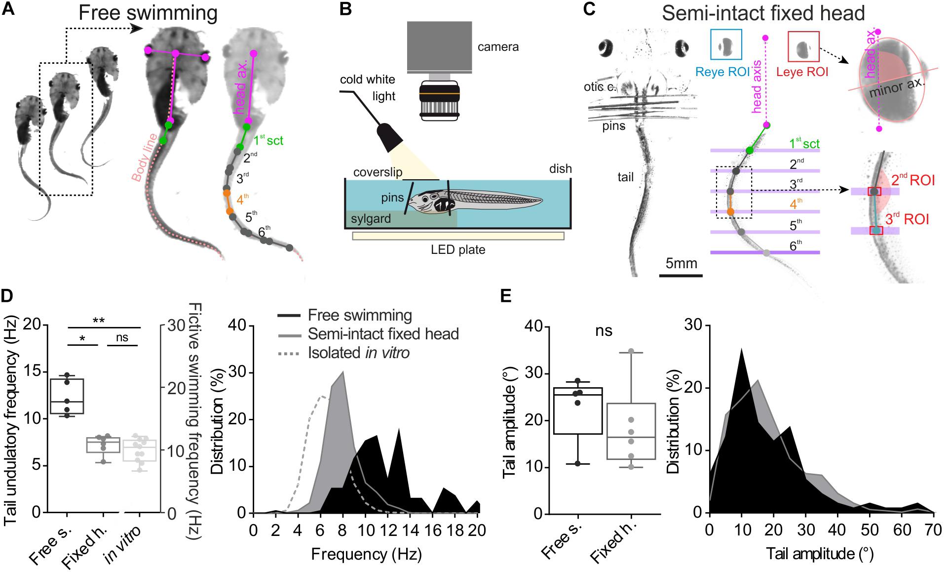 FIGURE 1. Method and comparison of swimming behavior in two different experimental conditions. (A) Free tadpole swimming was recorded by a camera placed above the tank. Then homemade imageJ macro was used to track eye position frame by frame and create body skeleton (light pink dot line). This macro provided XY coordinates of each point (color dots), used to calculate right/left angular excursion of the first tail section (1st sct, green line) and the body axis (body ax., pink line), and between each tail section. (B,C) Semi-intact preparations used to quantify the oculomotor behavior induced by swimming. To avoid any visuo-vestibular sensory inputs, optic cranial nerves were cut and the tadpoleâs head was fixed on the Sylgard by pins closed to its otic capsules (otic c.). The tail was free to swim in a deeper compartment. Homemade software tracked lateral movements and measured lateral angle values for each eye (eye ROI) between eye axis (minor ax.) and head axis (head ax.). Coordinates of each tail section (green, gray and blue dot) were calculated from tail ROI. (D) Mean undulation frequency of the first tail section during swimming was significantly lower (Dunnâs multiple comparisons test, p ⤠0.05) in head fixed (black bar, Fixed h., n = 7) preparations than in free swimming condition (dark gray bar, Free s., n = 5). Mean bursting frequency recorded in spinal rostral ventral root (light gray bar, in vitro, n = 11) was also lower than mean undulatory frequency of the first tail section measured in semi-intact or free swimming animals (Dunnâs multiple comparisons test, p < 0.001). (E) Averages and range of peak-to-peak tail amplitude movements were similar (MannâWhitney test, ns) in both experimental conditions.