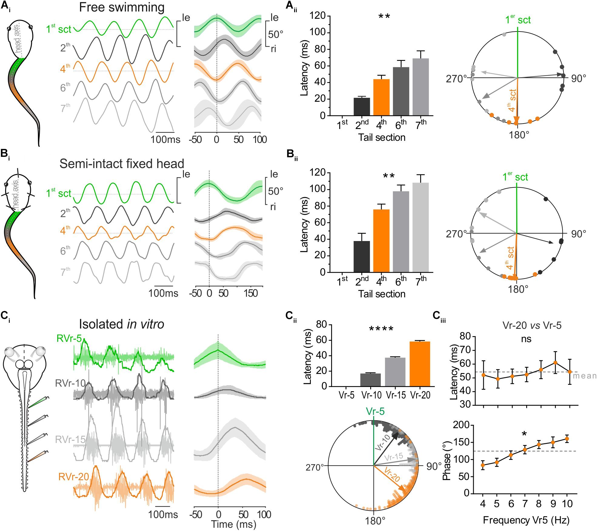 FIGURE 2. Temporal relationship between tail sections during larval swimming. (A) During free swimming (Ai) the sinewave-like undulatory movements of the tail were generated by alternative left and right excursion of 1st tail section (green trace, 1st sct) spread to next caudal sections. Tail sections were video-tracked frame by frame. Traces show angular excursion of each tail sct (in degree) over time. Cycle analysis (25 cycles) shows that the 4th tail section (orange trace, 4th sct) was totally out of phase with the 1st section (1st sct, green trace). (Aii) Mean latency between oscillations of the 1st and consecutive more caudal tail sections increased gradually and significantly (Kruskal–Wallis test, p < 0.01, n = 5). Therefore, the phase shift relative to the 1st section (green line) increased significantly (Watson–Williams test, p < 0.0001, n = 5. The 4th section was significantly out of phase (orange arrow) with the 1st tail section (V-test, p < 0.001, n = 5). (B) In semi-intact preparations, overlapping traces (Bi, 50 cycles) showed also that the 4th tail section (orange trace) was in phase opposition with the 1st tail section (green trace). (Bii) Mean latency between oscillations of the 1st and consecutive more caudal tail sections increased gradually and significantly (Kruskal–Wallis test, p < 0.01, n = 6). Therefore, the phase shift relative to the 1st section (green line) increased also significantly (Watson–Williams test, p < 0.0001, n = 5). The 4th section was significantly out of phase (orange arrow) with the 1st tail section (V-test, p < 0.001, n = 5). (C) Simultaneous extracellular recordings of spinal ventral roots (Vr) of brainstem-spinal cord preparations isolated in vitro showed a rostro-caudal delay typical for fictive swimming. The 20th Vr (orange trace) was consequently totally out of phase with the 5th Vr (green trace, 50 cycles). (Cii) The delay between the 5th root’s bursts and the next caudal Vrs (10, 15, and 20 successively) increased significantly (Kruskal–Wallis test, p < 0.01, 180 cycles) and consequently the phase shift of bursts recorded in Vrs 10, 15, and 20 relative to Vr-5 (green line) also increased significantly (Watson–Williams F-test, p < 0.0001, 180 cycles). Vr-20 (orange arrow) was significantly in phase opposition with Vr-5 (V-test, p < 0.0001, 180 cycles). (Ciii) On different in vitro preparations, latency and phase relationships of Vr-20 relative to Vr-5 bursts (Vr-20 vs. Vr-5) were calculated for fictive swimming frequencies ranging from 4 to 10 Hz. The latency didn’t change (Kruskal–Wallis test, ns, n = 7), whereas the phase relationship increased as the Vr-5 frequency was raised (Watson–Williams F-test, p < 0.01, n = 7).