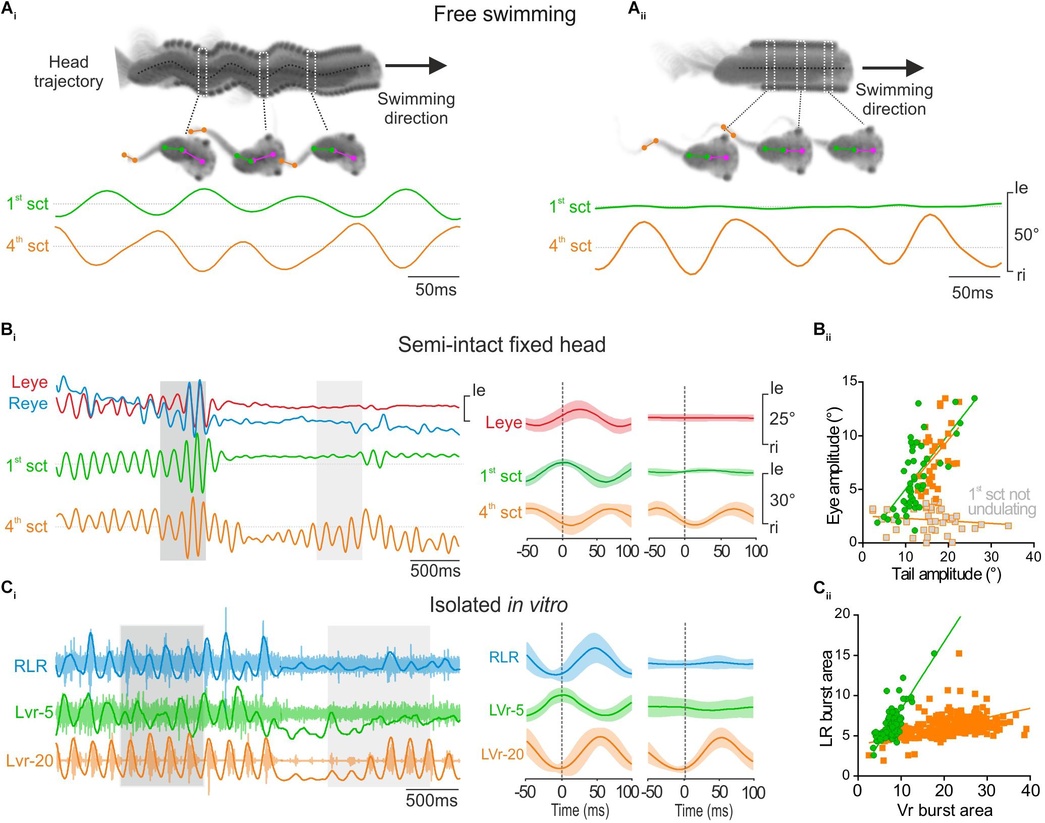 FIGURE 3. Propulsive swimming behavior triggered locomotor-induced eye movement. (A) Tadpole swimming (freely behaving) captured on camera during strong propulsive swimming which provoked angular head movements (head trajectory, dark dot line) (Ai) or during weak swimming without oscillatory head movements (Aii). During strong propulsion (Ai), the 1st tail section (green trace, 1st sct) undulated in phase opposition with the 4th tail section (orange trace, 4th sct). In contrast, during slow swimming (Aii), the more rostral (1st) tail section showed no oscillation. (B) When the 1st tail section (green trace) undulated in head fixed condition (dark gray area), related to strong swimming, angular excursions of the 1st tail section were always propagated to 4th tail section, and appeared also associated with conjugated eye movements (red and blue traces, respectively, left and right eyes) with a weak shift phase (see left overlapping traces, 50 cycles). In contrast, locomotor-induced eye movements didnât occur when the 4th tail section undulated alone (see light gray area and right overlapping traces, 50 cycles). (Bii) The magnitude of lateral eye angular excursion was linearly correlated with the amplitude of the 1st tail section undulatory movements with an average gain close to 0.5 (green circle and line, r2 = 0.46; s = 0.51 ± 0.08) during strong propulsive swimming. Therefore, the correlation between the amplitude of eye angular excursion and the amplitude of the 4th tail section movements was also linear with a gain highly similar (orange square and line, r2 = 0.21; s = 0.47 ± 0.16) in the same condition. In contrast, the amplitude of eye movements was not correlated with the amplitude of 4th tail section movements when tadpole generated slow swimming (gray square, r2 = 0.02; s = â0.02 ± 0.02). (C) Simultaneous recordings of the right lateral rectus (RLR), the 5th contralateral spinal ventral root (LVr-5) and the 20th left spinal ventral root (LVr-20) activities from an isolated in vitro preparation (Ci), during a strong (dark gray area) or weak (light gray area) swimming. Integrated traces (dark lines) were superimposed on raw traces (light traces). Bursting activities recorded on RLR (blue trace) occurred in phase with LVr-20 (orange trace) and in phase opposition with LVr-5 (green trace) (see mean overlapped traces on left, 120 cycles). (Cii) Burst areas of LR were strongly linearly correlated (r2 = 0.80; s = 0.83 ± 0.04) with Vr-5 burst area during propulsive swimming (green circle and line). Conversely during weak swimming, only LVr-20 discharged (mean overlapped traces on right, Ci, 41 cycles) and thus LR burst areas were weakly correlated with the Vr-20 bursts area (orange square and line, r2 = 0.18; s = 0.11 ± 0.01).