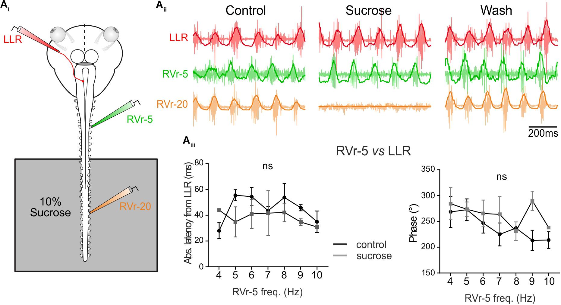 FIGURE 5. Temporal relationship of spino-extraocular motor coupling is only adjusted in rostral spinal CPG. (Ai) Schematic of the in vitro preparation showing the recorded nerves and the experimental condition. (Aii-Control) Recording of spontaneous coordinated bursting discharge from left lateral rectus (LLR, red traces), and two contralateral spinal ventral roots (the 5th: RVr-5, green traces and the 20th: RVr-20 orange traces) during fictive swimming. Each raw trace was integrated and the result superimposed on the corresponding raw trace. Application of 10% sucrose on spinal segments more caudal than the 12th spinal ventral root (see schematic) blocked their activities as revealed by the Vr-20 recording without changing the temporal relationships between RVr-5 and LLR. (Aiii) Absolute latency average between LLR and RVr-5 did not differ (two-way ANOVA, ns, n = 3) in control and in sucrose condition on a range of fictive swimming frequency (4–10 Hz). Consequently, for all swimming frequencies, the phase relationship between the RVr-5 and the LLR was not significantly different in control compared to sucrose condition.