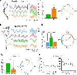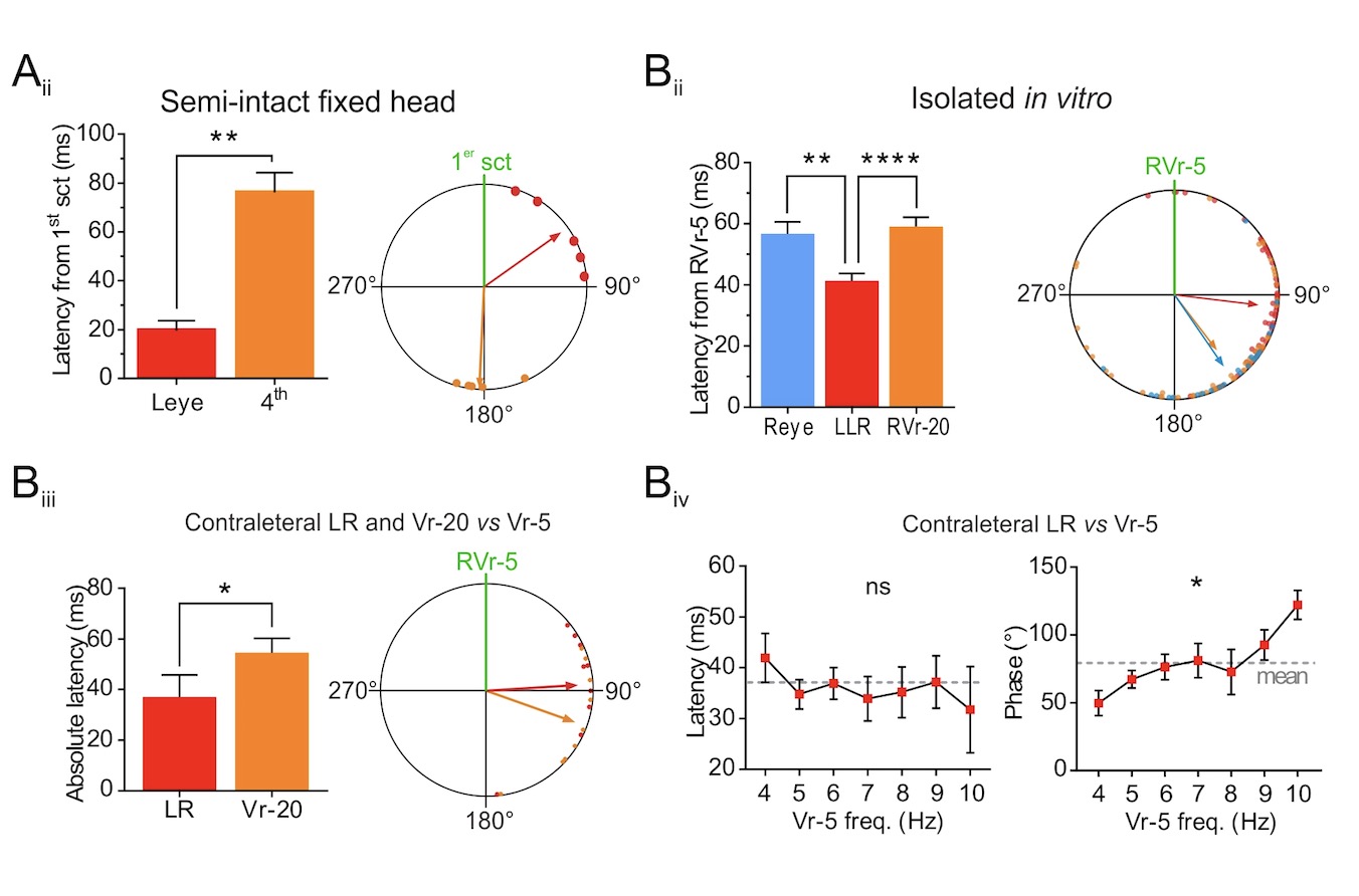 FIGURE S1, Supplemental data for Figure 4 | Histograms and Polar plots showing the time relationships (latency and phase) between the 1st tail section (sct) and the Leye and 4th section in semi-intact preparations (A); between the RVr-5 and Reye, LLR and RVr-20 (B) recorded in vitro; between RVr-5 and LLR or RVr-20 (C) and between RVr-5 and LLR (D) The four panels are, respectively, equivalent to Aii, Bii, Biii, and Biv of Figure 4 but by taking either the 1st sct (A) or the RVr-5 (B–D) as the phase marker. A; Mann Whitney test, p < 0,01, n = 5. B; histogram statistics: Dunn’s multiple comparisons test, p < 0.01 and p < 0.0001; polar plot statistic: Watson–Williams F-test, p < 0.001; 61 cycles. C; histogram statistics: Mann–Whitney test, p < 0,05, n = 10 and n = 7; polar plot statistic: Watson–Williams F-test, p < 0.001. D; left side plot: Kruskal–Wallis test, ns, n = 8; right side plot: Watson–Williams F-test, p < 0.05, n = 8.
