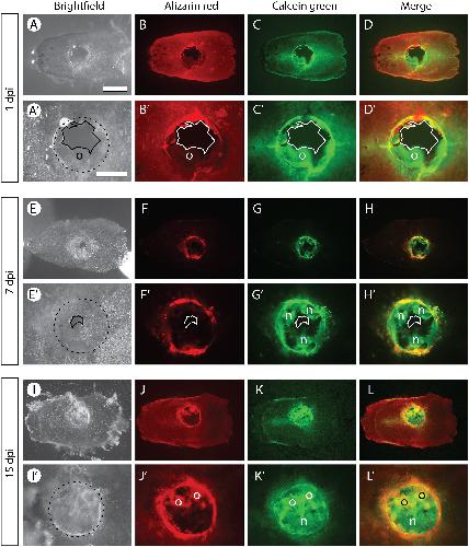 Brightfield and fluorescent pictures of calvariae dissected from tadpoles having been subjected to an Alizarin red pulse 1 h before traumatic skull injury (at stage NF60), and subsequently exposed to a Calcein green pulse at 1 (A–D, A′–D′), 7 (E–H, E′–H′) or 15 (I–L, I′–L′) dpi. The dotted circles in A′, E′ and I′ delineate the injured zone. A continuous line in A′–D′ and E′–H′ delineates a mineralized matrix-free region. Regions of the matrix located within the circular lesion that are either double positive (o, old bone), or Alizarin red-negative and Calcein green-positive (n, new bone), are indicated. Note that the Alizarin red signal in (B′) is faint as the dislodged bone (o) is out of focus. The scale bar shown in (A) represents 1 mm in (A–D, E–H, I–L). The scale bar shown in (A′) represents 500 μm in (A′–D′, E′–H′, I′–L′). Calvariae are shown in dorsal views with their anterior region towards the left. (For interpretation of the references to colour in this figure legend, the reader is referred to the web version of this article.)