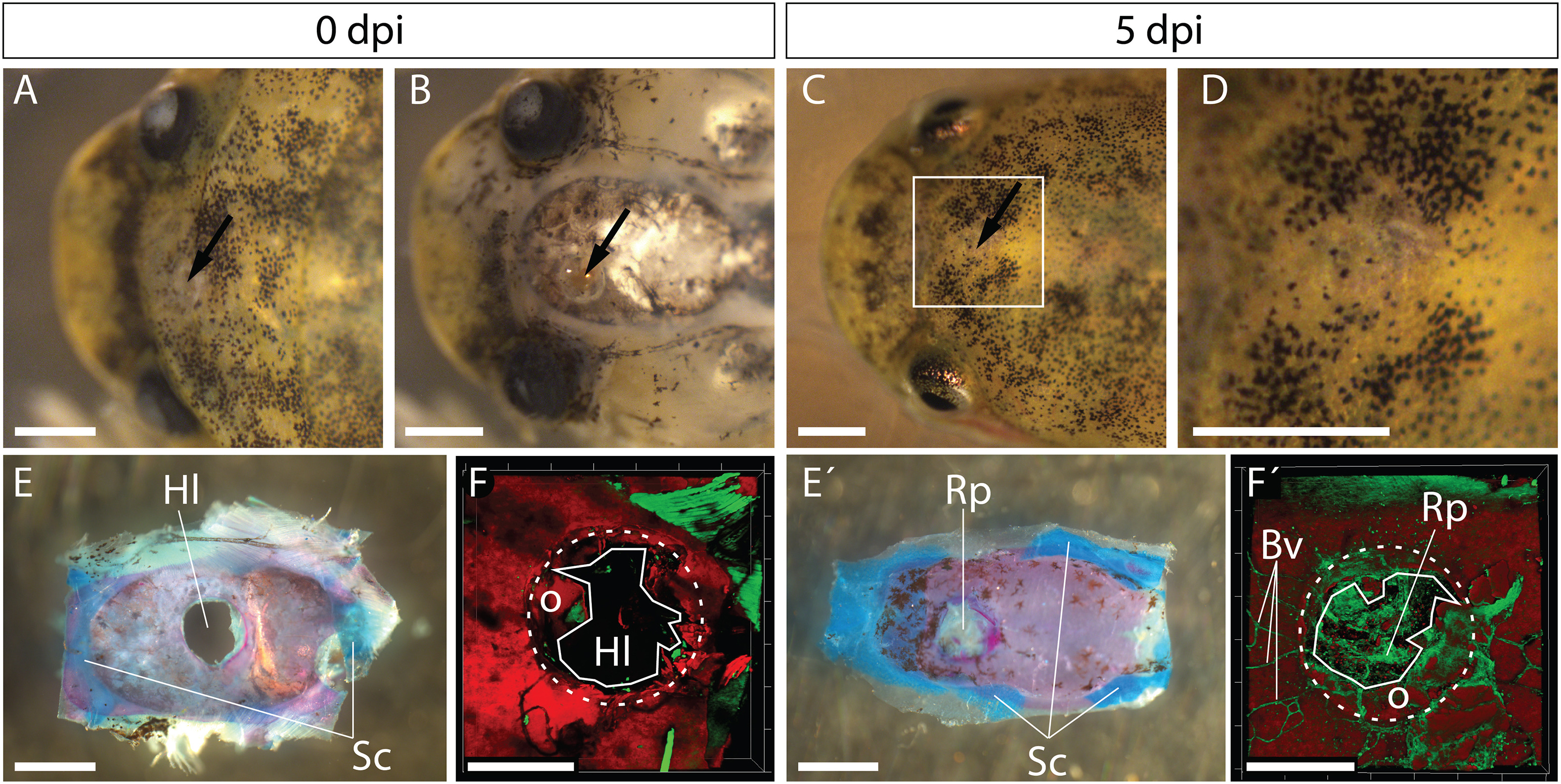 Stage NF66 Xenopus specimens were subjected to skull damage and examined at 0 (A, B, E and F) and 5 (C, D, E′ and F′) days post-injury (dpi). A dorsal view of the head is shown before (A) and after (B) skinning. (C) Dorsal view showing that regenerating skin has covered the wound at 5 dpi. Arrows in (A–C) point at the impact site. The region delineated by a white square in (C) is shown at a higher magnification in (D). (E, E′) Calvariae were dissected together with their surrounding tissue serving as an internal positive control for the presence of cartilage (Sc, skull cartilage), and double stained with Alizarin red and Alcian blue. (F, F′) Three-dimensional reconstructions of dissected calvariae stained for bone mineral (Alizarin red, red) and cell bodies (Alexa Fluor 488-phalloidin, green). Note that the hollow lesion (Hl) converts into an Alcian blue-negative regeneration plug (Rp) highly irrigated by blood vessels (Bv) in five days. The dotted circles in F and F´ show the injured zone which contains remnants of “old” (non-regenerated) matrix (“o”, located between the continuous and dotted lines). Anterior is left in all panels. Scale bars represent 1 mm in (A–E and E´) and 500 μm in (F and F′). (For interpretation of the references to colour in this figure legend, the reader is referred to the web version of this article.)