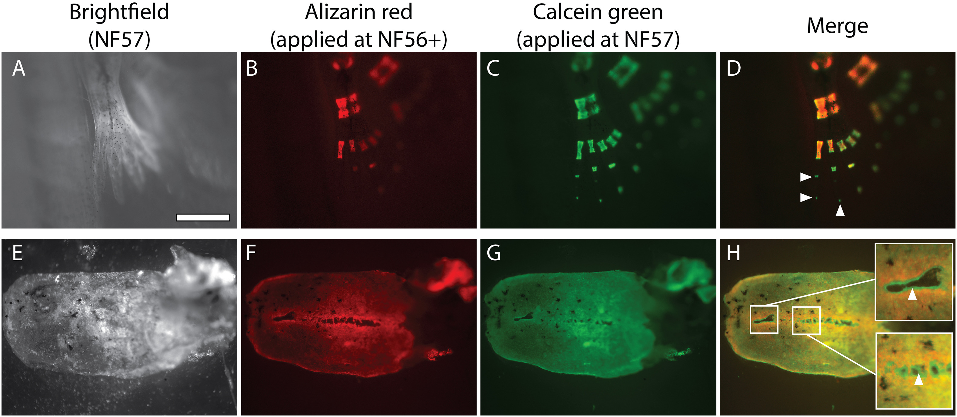 A tadpole was subjected to an Alizarin red pulse at the NF56+ stage (an intermediate stage between NF56 and NF57) and to a Calcein green pulse at stage NF57. Hindlimbs (AâD, anterior up) and dissected calvaria (EâH, anterior left) were photographed at stage NF57 as indicated. The arrowheads in (D and H) point at Alizarin red-negative and Calcein green-positive matrix regions. In (H) the regions delineated by white squares are shown at higher magnification (insets). The scale bar represents 1â¯mm in all panels. (For interpretation of the references to colour in this figure legend, the reader is referred to the web version of this article.)