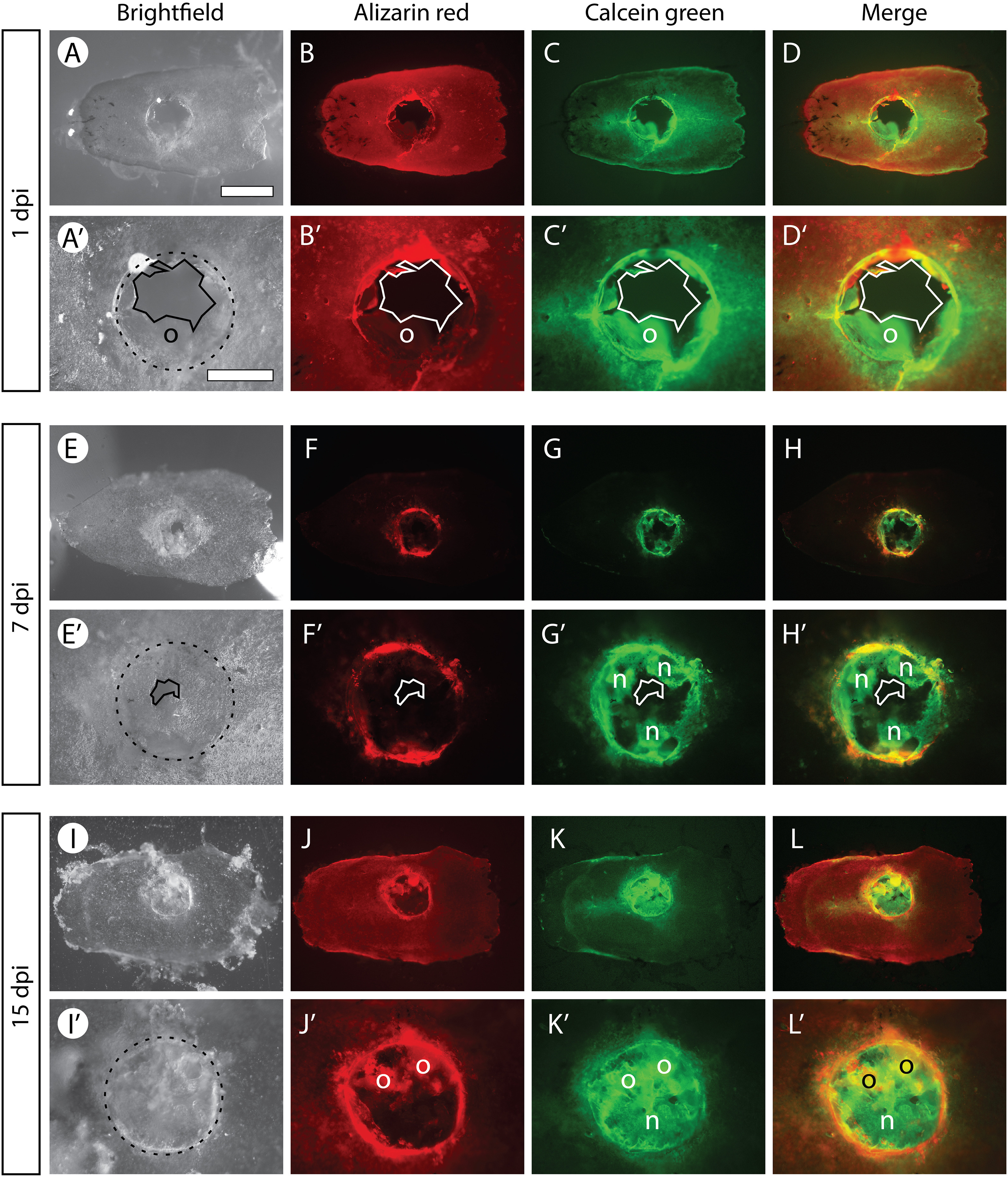 Brightfield and fluorescent pictures of calvariae dissected from tadpoles having been subjected to an Alizarin red pulse 1 h before traumatic skull injury (at stage NF60), and subsequently exposed to a Calcein green pulse at 1 (A–D, A′–D′), 7 (E–H, E′–H′) or 15 (I–L, I′–L′) dpi. The dotted circles in A′, E′ and I′ delineate the injured zone. A continuous line in A′–D′ and E′–H′ delineates a mineralized matrix-free region. Regions of the matrix located within the circular lesion that are either double positive (o, old bone), or Alizarin red-negative and Calcein green-positive (n, new bone), are indicated. Note that the Alizarin red signal in (B′) is faint as the dislodged bone (o) is out of focus. The scale bar shown in (A) represents 1 mm in (A–D, E–H, I–L). The scale bar shown in (A′) represents 500 μm in (A′–D′, E′–H′, I′–L′). Calvariae are shown in dorsal views with their anterior region towards the left. (For interpretation of the references to colour in this figure legend, the reader is referred to the web version of this article.)