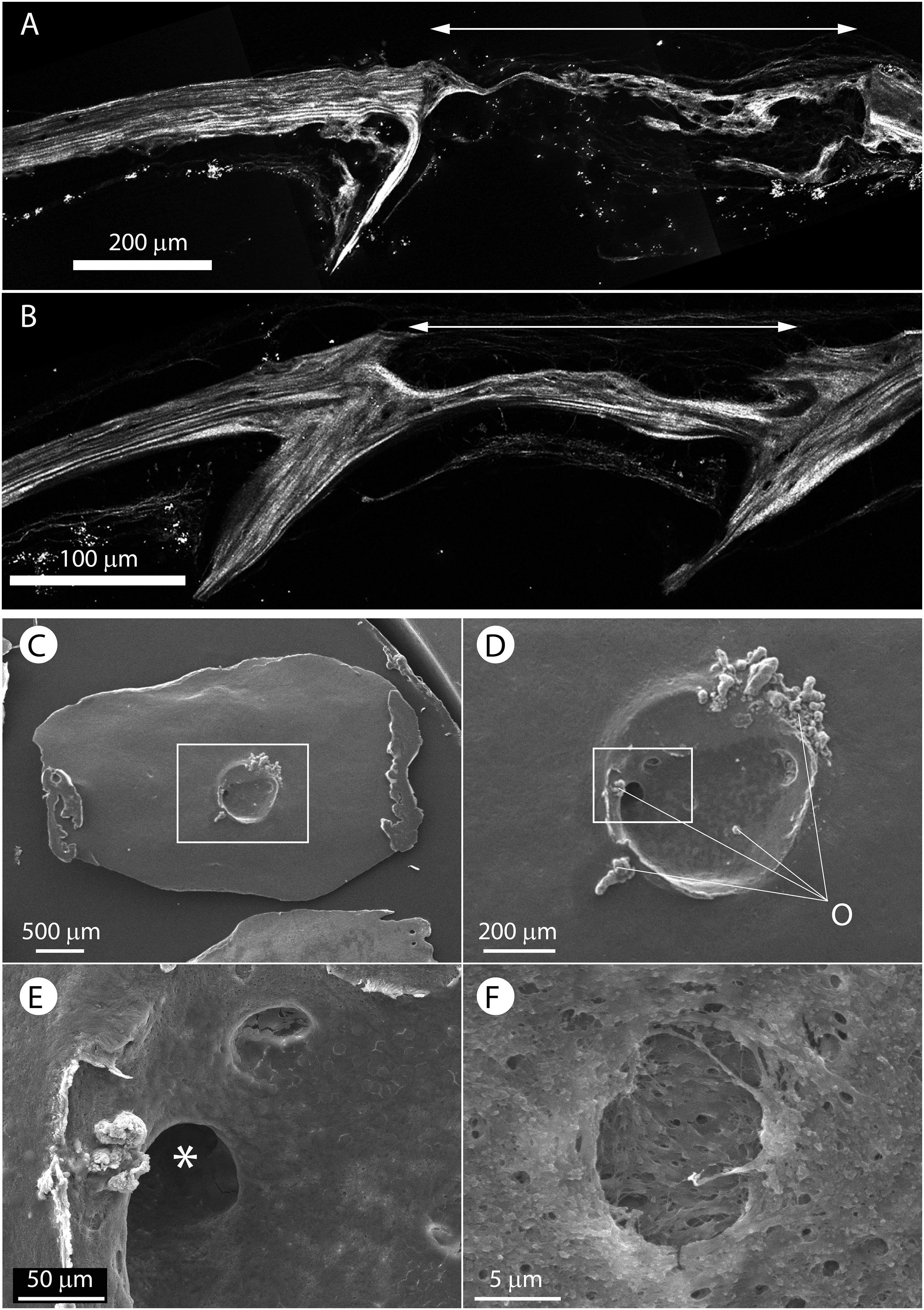 (A, B) Collagen second harmonic imaging was performed at 15 (A) and 30 (B) dpi (dorsal upward). The impact site is delineated by a double arrow. Note that at 15 dpi the regenerated matrix is thin, disorganized and displays characteristics of woven bone. By contrast, matrix located outside of the damaged zone and within the 30 dpi regenerated bone exhibit collagen fibers that are tightly packed in parallel layers characteristic of lamellar bone. (C–F) A 30 dpi calvaria was examined by scanning electron microscopy (anterior to the left). The regions delineated by rectangles in (C) and (D) are shown at higher magnification in (D) and (E), respectively. (C) Whole calvaria. (D) Damaged site. Note the presence of irregular bone remnants (o) resulting from the drilling of the older matrix. (E) Circular cavities (⁎) are present within the regenerating region. (F) A superficial osteocyte lacuna from the regenerating region. Note the presence of collagen fibers and osteocytic canaliculi.