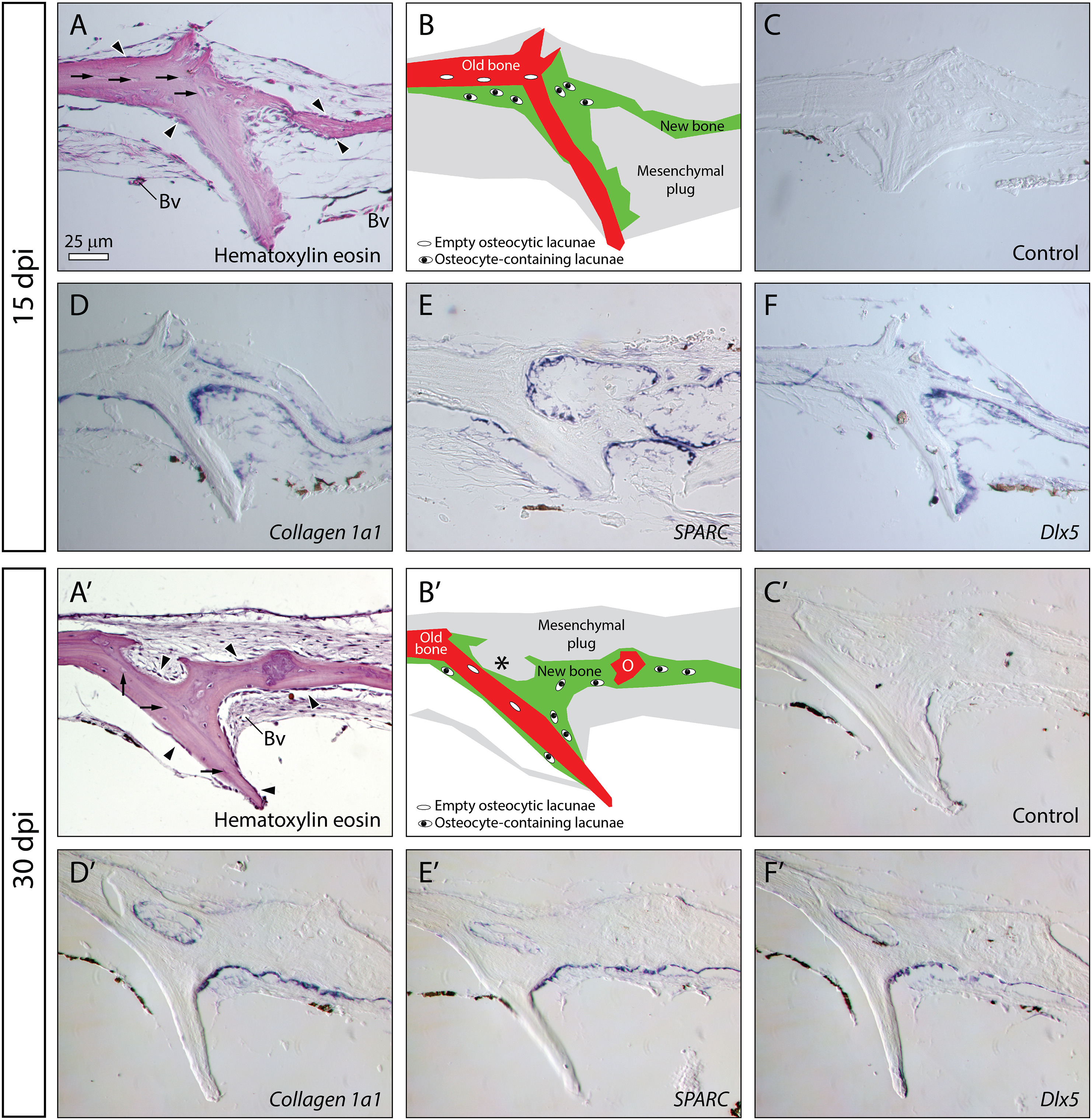 Calvariae were damaged at stage NF60 and were allowed to regenerate for 15 (AâF) and 30 (Aâ²âFâ²) days. (AâAâ²) Hematoxylin eosin staining of histological sections located at the transition zone between the âoldâ and ânewâ (regenerated) bone. Schematic drawing of (A) and (Aâ²) are shown in (B) and (Bâ²) respectively. Note the presence of abundant mesenchyme irrigated by blood vessels (Bv). The newly formed bone (green in B, Bâ²) contacts the matrix of the damaged calvaria (red in B and Bâ²) where empty osteocyte lacunae lie (arrows in A, Aâ²). Osteoblasts cover the surface of both the old and new bone matrix (arrowheads in A and Aâ²). At 30â¯dpi, an irregular old bone matrix remnant (o in Bâ²) is found embedded within the regenerated bone, and a cavity filled with mesenchyme can be observed within the regenerating region (* in Bâ²). In situ hybridization was performed using a control probe (C, Câ²), or probes specific to the Collagen 1a1 (D, Dâ²), SPARC (E, Eâ²) and Dlx5 (F, Fâ²) genes, revealing strong expression in osteoblastic cells at both stages. Dorsal is up in all panels. (For interpretation of the references to colour in this figure legend, the reader is referred to the web version of this article.)