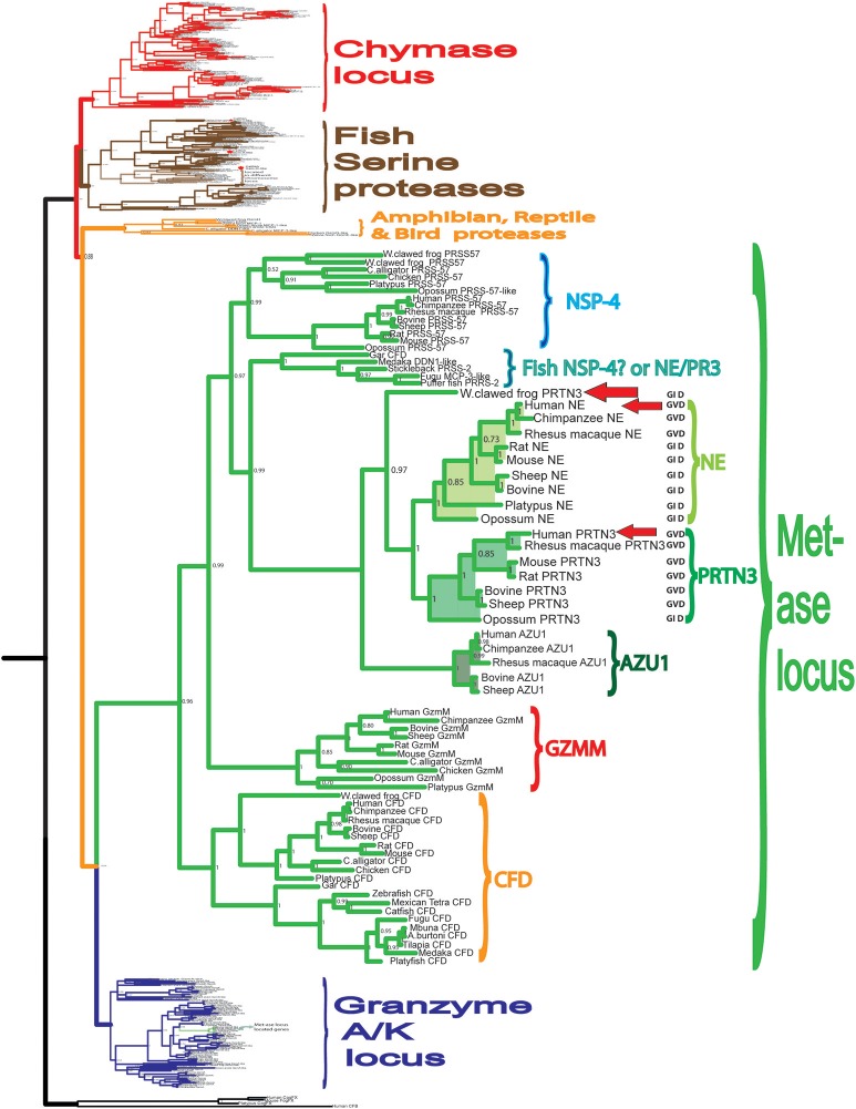 Figure 1. Phylogenetic analysis of the hematopoietic serine proteases. A phylogenetic tree of a large number of different vertebrate hematopoietic serine proteases using the MrBayes program. The proteases encoded within the metase locus are enlarged and highlighted and the three proteases analyzed in this communication, hNE, hPR-3, and Xenopus PR-3 are marked by red arrows.