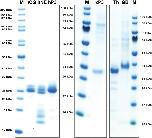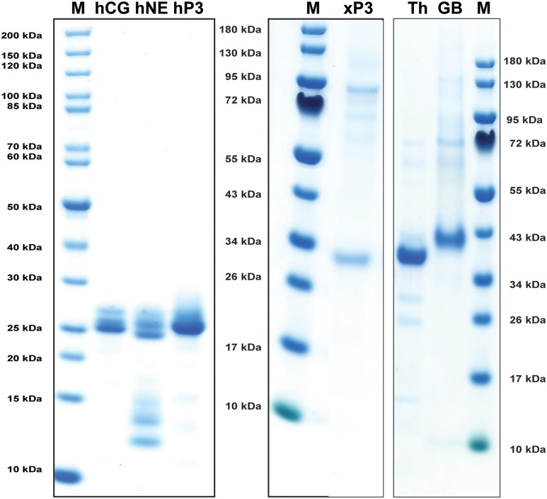 Figure 2. Analysis of the purified hNE, hPR-3, hCG, Xenopus PR-3, human thrombin (Th) and human granzyme B (GB) used in the chromogenic substrate assay and in the determination of the extended cleavage specificity. The three human neutrophil enzymes were commercial preparations purified from peripheral blood neutrophils. The Xenopus PR-3 was produced in the human cell line HEK293-EBNA. The xPR-3 proenzyme was first purified on Ni-NTA beads (–EK) and then activated by removal of the His6-tag by enterokinase digestion (+EK). The enzymes were analyzed by separation on SDS-PAGE and visualized with Coomassie Brilliant Blue staining.