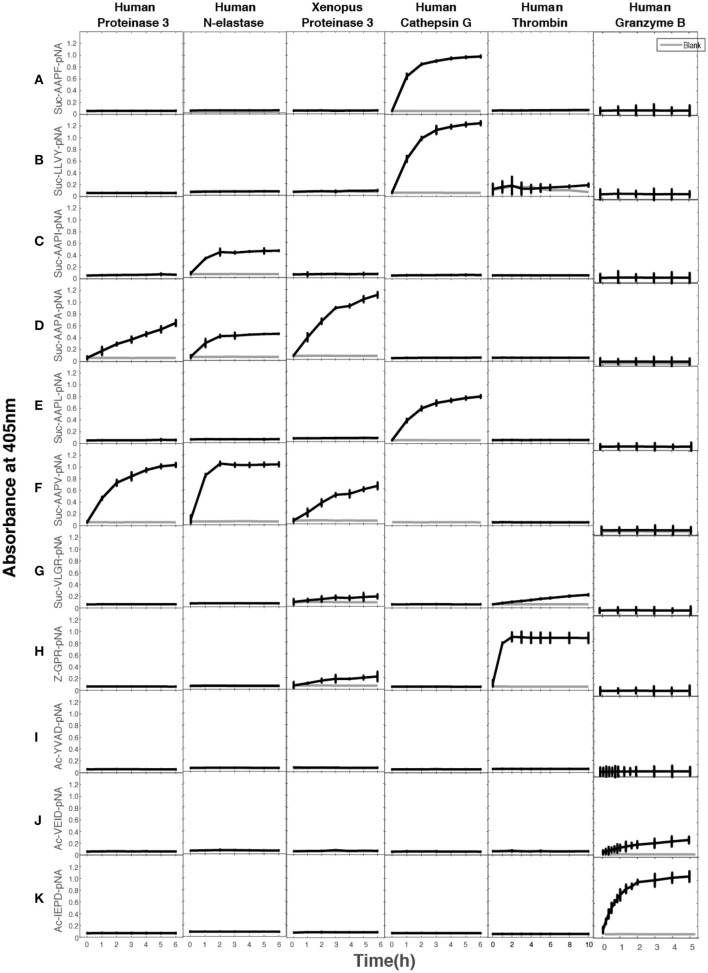 Figure 3. Chromogenic substrate assay. (AâK) A panel of different chromogenic substrates was used to determine the primary specificity of hNE, HPR-3, xPR-3, hCG, human granzyme B, and human thrombin. The panel included different chymase, elastase, tryptase and aspase substrates. The amino acid sequences of the substrates are listed on the left side of the figure. Human thrombin, hCG, and human granzyme B were included as reference enzymes for tryptase, chymase, and asp-ase activities, respectively.