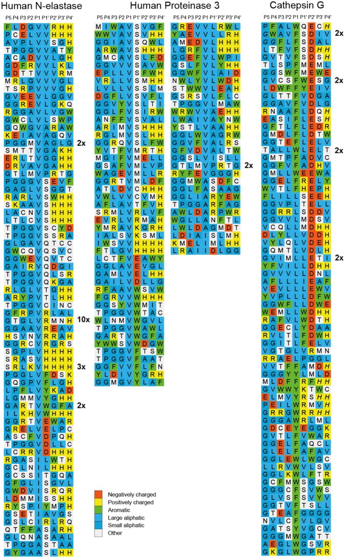 Figure 4. Phage displayed nonamers susceptible to cleavage by hNE, hPR-3 and hCG after five biopannings. After the last selection step, phages released by proteolytic cleavage of the three proteases were isolated and the sequences encoding the nonamers were determined. The general sequence of the T7 phage capsid proteins are PGG(X)9HHHHHH, where (X)9 indicates the randomized nonamers. The protein sequences were aligned into a P5-P4′ consensus, where cleavage occurs between positions P1 and P1′. Sequences occurring more than once are marked by the corresponding number to the right of the sequence. The aa are color coded according to the side chain properties as indicated in the legend.