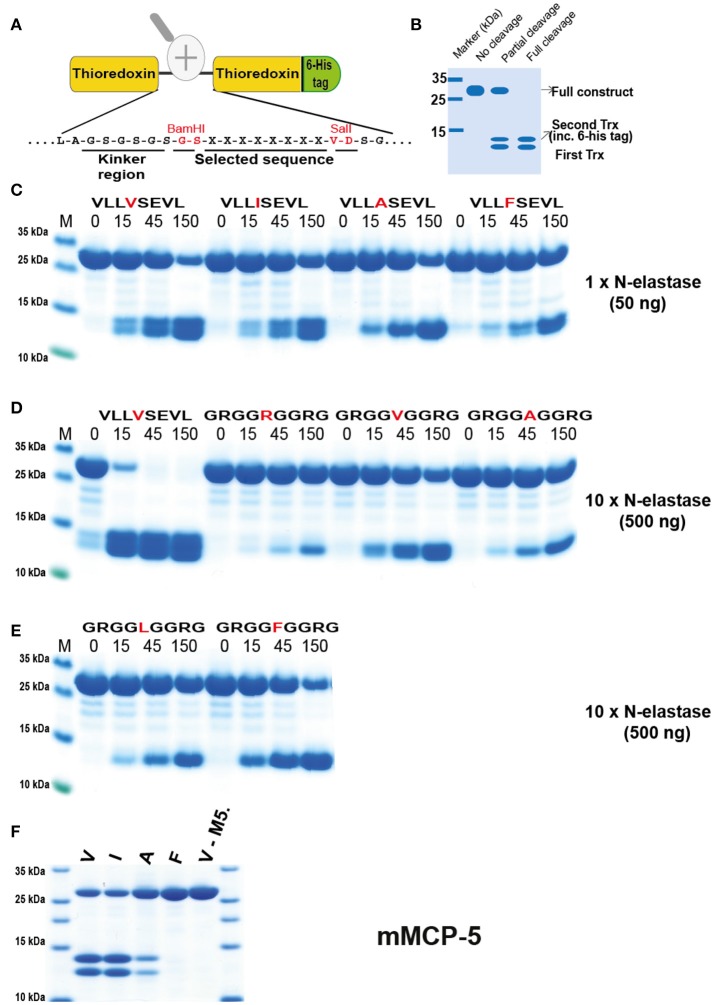 Figure 5. Analysis of the cleavage specificity of hNE by the use of recombinant protein substrates. (A) Shows the overall structure of the recombinant protein substrates used for analysis of the efficiency in cleavage by the different enzymes in Figures 5â10. In these substrates two thioredoxin (trx) molecules are positioned in tandem and the adjacent trx has a His6-tag positioned in its C terminus. The different cleavable sequences are inserted in the linker region between the two trx molecules by the use of two unique restriction sites, one Bam HI and one Sal I site, which are indicated in A. (B) A hypothetical cleavage is shown to highlight possible cleavage patterns. (CâE) Cleavage of recombinant substrates by hNE at different enzyme concentrations (50 or 500 ng). The name and sequence of the different substrates are indicated above the pictures of the gels. The time of cleavage in minutes is also indicated above the corresponding lanes of the different gels. The uncleaved substrates have a molecular weight of ~25 kDa and the cleaved substrates appear as two closely located bands with a size of 12â13 kDa. The cleavage of a panel of substrates with a more strict elastase, as represented by mouse mast cell protease 5, was included in (F).
