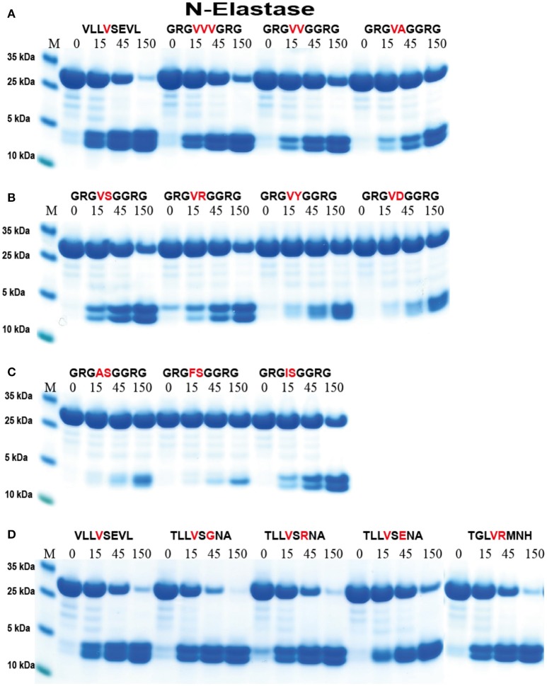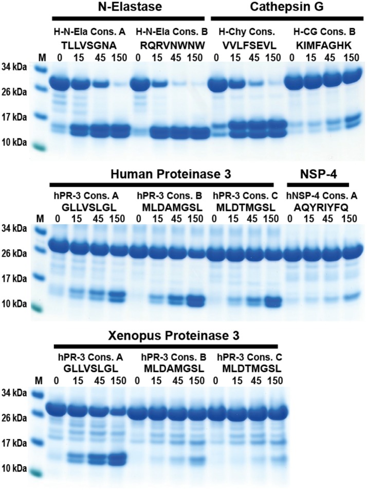Figure 6. Analysis of the cleavage specificity of hNE by the use of recombinant protein substrates. (A–D) Shows the cleavages of a number of substrates by hNE. The sequences of the different substrates are indicated above the pictures of the gels. The time of cleavage in minutes is also indicated above the corresponding lanes of the different gels. The uncleaved substrates have a molecular weight of ~25 kDa and the cleaved substrates appear as two closely located bands with a size of 12–13 kDa.