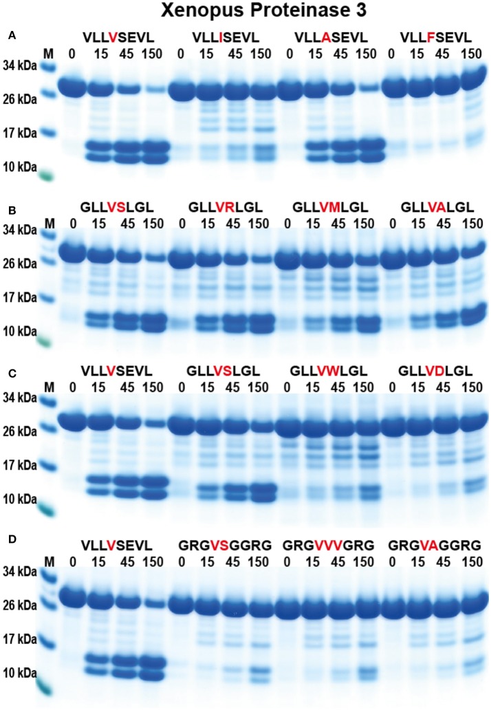 Figure 8. Analysis of the cleavage specificity of Xenopus PR-3 by the use of recombinant protein substrates. (A–D) Shows the cleavages of a number of substrates by hPR-3. The sequences of the different substrates are indicated above the pictures of the gels. The time of cleavage in minutes is also indicated above the corresponding lanes of the different gels. The uncleaved substrates have a molecular weight of ~25 kDa and the cleaved substrates appear as two closely located bands with a size of 12–13 kDa.