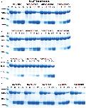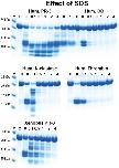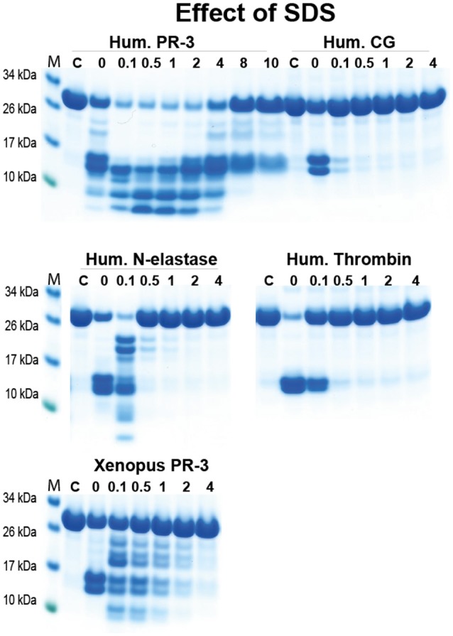 Figure 9. Analysis of the effect of different concentrations of SDS on the cleavage efficiency by five different enzymes, hPR-3, hNE, hCG, human thrombin and xPR-3. Consensus substrate sequences for the different enzymes were inserted in the 2x Trx substrates as shown in Figure 5. These substrates were then were used to analyze the effect of different SDS concentration on the cleavage efficiency by the five different enzymes. We used the substrate (VLLVSEVL) for hNE, the substrate (VLLFSEVL) for hCG, the substrate (VLLVSEVL) for hPR-3, the substrate (LTPRGVRL) for human thrombin and the substrate (VLLVSEVL) for Xenopus PR-3. Lane C for the different enzymes is a control without SDS. The concentrations of the SDS are then listed above the corresponding lane from 0.1 to 8%. The uncleared substrates have a molecular weight of ≈25 kDa and the cleaved substrates appear as two closely located bands with a size of 12–13 kDa. Due to the effect of the SDS to open the protein structure of the Trx molecules cleavage also occur within the Trx molecules, which results in additional bands of different molecular weights.