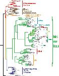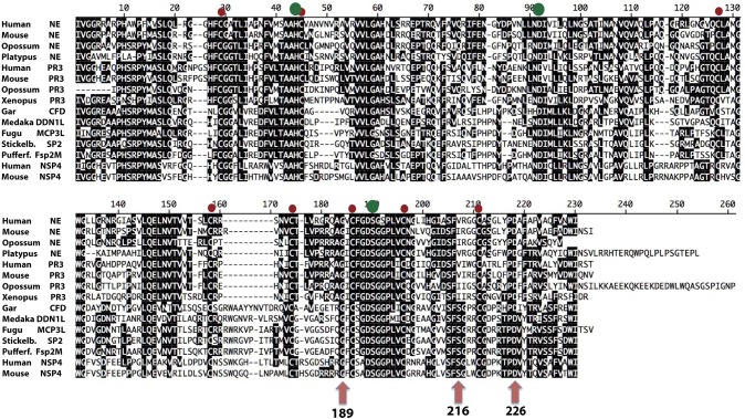 Figure 11. Alignment of a panel of NE, PR-3, and NSP-4 sequences. The sequences of a panel of NSP-4, NE, and PR3 sequences from mammals and amphibians were aligned using the Clustal W algorithm in the DNASTAR program together with a small subfamily of fish proteases that cluster between NSP-4 and NE and PR-3 in the phylogenetic tree shown (from Figure 1). The conserved cysteines are marked with red dots and the three residues of the catalytic triad, His-Asp-Ser, with larger green dots. The three residues with positions 189, 216, and 226 in bovine chymotrypsin are marked with purple arrows. These three residues, are in many trypsin related serine proteases, located in the bottom and the sides of the pocket of the protease where the P1 residue of the substrate is positioned upon cleavage.