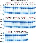 Figure 7. Analysis of the cleavage specificity of hPR-3 by the use of recombinant protein substrates. (A–C) Shows the cleavages of a number of substrates by hPR-3. The sequences of the different substrates are indicated above the pictures of the gels. The time of cleavage in minutes is also indicated above the corresponding lanes of the different gels. The uncleaved substrates have a molecular weight of ~25 kDa and the cleaved substrates appear as two closely located bands with a size of 12–13 kDa.