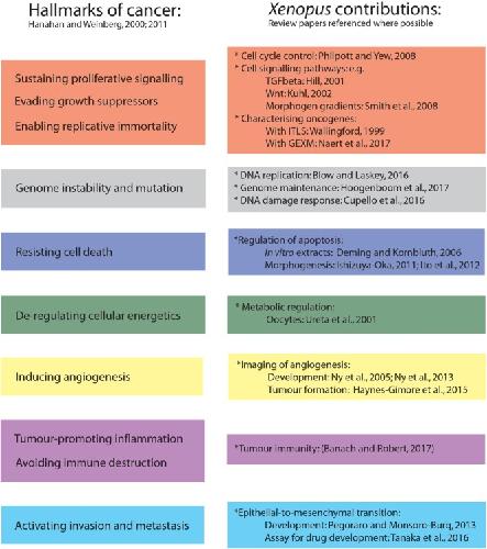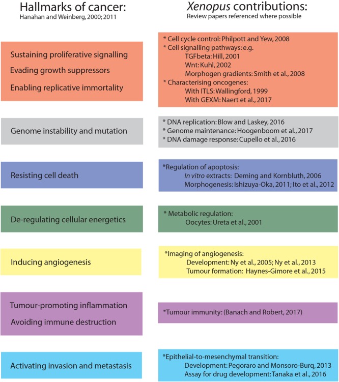 FIGURE 1. Using the full Xenopus repertoire to inform on the hallmarks of cancer. Ten hallmarks of cancer are recognised (left) and Xenopus studies have informed on each of these aspects (right) as described in the main text. Where possible review papers are referenced to direct readers to further discussion of each topic. ITLSs, induced-tumour-like-structures; GEXM, genetically engineered Xenopus models.