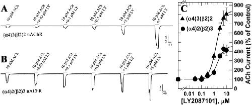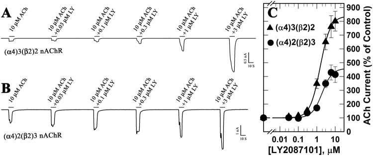 Figure 2. LY2087101 potentiates low- and high-sensitivity α4β2 nAChRs. Xenopus oocytes expressing human (α4)3(β2)2 (▲) or (α4)2(β2)3 (●) nAChRs were voltage-clamped at −50 mV, and currents elicited by 10-second applications of 10 µM ACh were recorded in the absence or presence of increasing concentration of LY2087101. (A and B) representative two-electrode voltage clamp traces showing the effect of increasing concentrations of LY2087101 on ACh-induced current responses of Xenopus oocytes expressing (α4)3(β2)2 and (α4)2(β2)3 nAChRs, respectively. (C) For each recording run, peak currents response were normalized to the peak current response elicited by 10 µM ACh alone, replicas from individual oocytes were averaged. Data (Average ± SE) from 26 (▲) and 7 (●) oocytes were plotted and fit to three parameters equation (Equation 1). LY2087101 potentiation of (α4)3(β2)2 and (α4)2(β2)3 nAChRs was characterized by EC50s of 1.4 ± 0.03 and 1.9 ± 0.04 µM, and Imax of 837 ± 7 and 459 ± 34%, respectively.