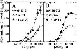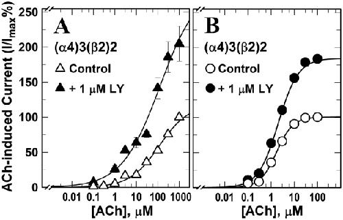 Figure 3. Effect of LY2087101 on the ACh dose-response curves of low- and high-sensitivity α4β2 nAChRs. ACh current responses of Xenopus oocytes expressing human (α4)3(β2)2 (A, △, ▲) or (α4)2(β2)3 (B, ●, ○) nAChRs were recorded in the absence of any other drug (△,○) and in the presence of 1 µM LY2087101 (▲, ●). For each ACh concentration (−/+LY2087101), peak current response was normalized to the peak current response elicited by 1 mM ACh in the same recording run. Replicas from individual oocytes were averaged and Averages ± SE for N oocytes (A, 18 (△), 8 (▲); B, 12 (○), 13 (●)) were plotted and fit to Equation 1. Values of ACh EC50/h/Imax were: for (α4)3(β2)2 nAChR (A), ACh (control), 113 ± 26 μM/0.66 ± 0.06/117 ± 6%; ACh(+1 LY2087101), 71 ± 25 μM/0.7 ± 0.1/251 ± 19%; for (α4)2(β2)3 nAChR (B), ACh (control), 1.7 ± 0.1 μM/1.2 ± 0.03/100 ± 1%; ACh (+1 LY2087101), 2.1 ± 0.1 μM/1.0 ± 0.04/189 ± 2%.