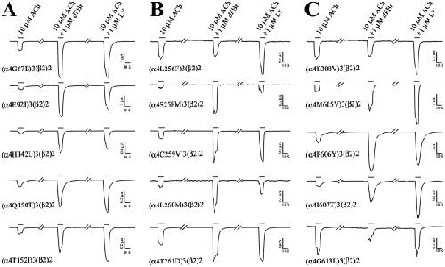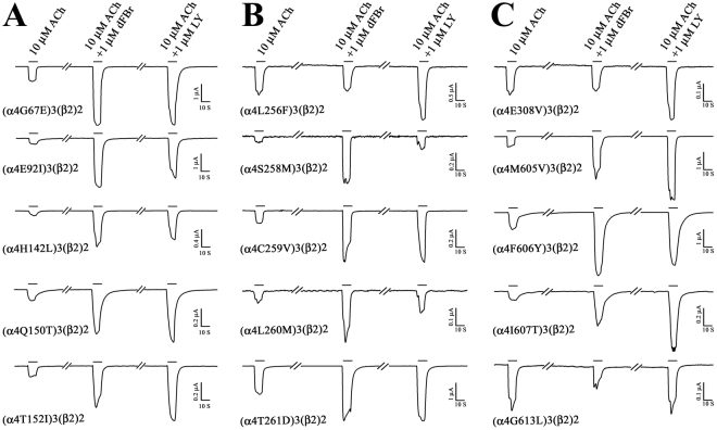 Figure 5. Effect of Amino acid substitutions within α4 extracellular and transmembrane domains on LY2087101 and dFBr potentiation of (α4)3(β2)2 nAChR. Representative two-electrode voltage clamp traces showing the effect of 1 μM LY2087101 or 1 μM dFBr on ACh-induced current responses of Xenopus oocytes expressing (α4)3(β2)2 nAChRs containing an amino acid substitution at the α4 subunit extracellular domain (A) or within the α4 subunit transmembrane domain (B and C).