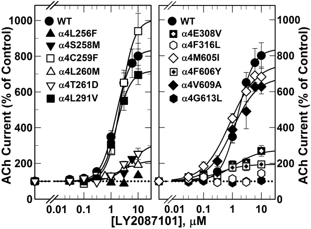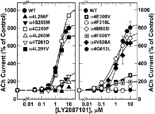 Figure 6. LY2087101 concentration-dependent potentiation of WT and mutant α4β2 nAChRs. Peak ACh-induced current responses of Xenopus oocytes expressing WT or mutant (α4)3(β2)2 nAChRs in the presence of increasing concentrations of LY2087101 were normalized to the peak current elicited by 10 µM ACh alone. Shown are data (Average ± SE) from several oocytes. Data were fit to a single site model using Equation 1 and parameters (potentiation EC50 and Imax) are shown in Table 2.